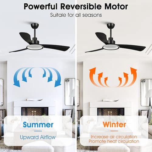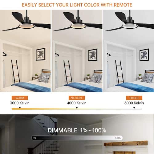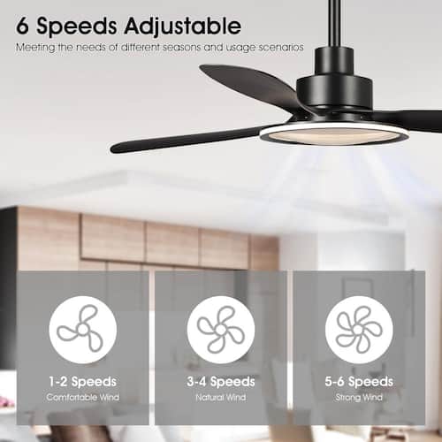 About This Product:Bring a modern touch to your indoor spaces with this 52 in. Modern Indoor Integrated LED Matte Black 3-Blade Ceiling Fan with Light, Reversible DC Motor and 6-speed Remote. This 52 in. fan features a unique integrated LED ring light that provides powerful illumination and adds an eye-catching element to any room. The Matte Black finish and 3 ABS blades give you the flexibility to choose between a uniform, contemporary look or a rich and contrasting Zebrawood finish. with its ultra-powerful motor, reversible air movement and included remote control, this LED ceiling fan offers the ultimate convenience and comfort for any season.