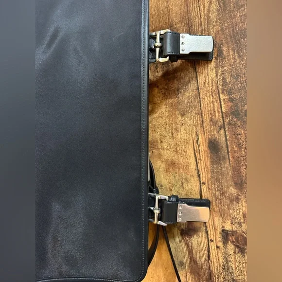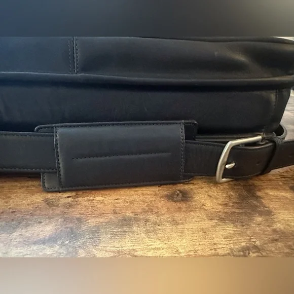 Black leather coach briefcase messenger bag. Appears barely used. Vintage Hudson bag?Interior immaculate. Plenty of room and compartments for laptop, files or books. Could be carried crossbody or over shoulder.One flaw noted to front bottom of bag possible divot see photo. Spot inside for business cards. Pen holders. Zipper pockets. Beautiful leather. See photos for measurements.Items will ship tue-Friday. I work 3x 12’s the other days.