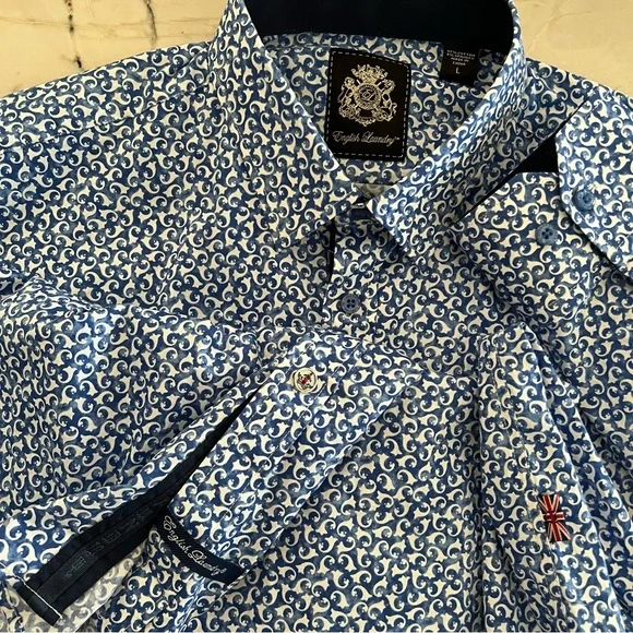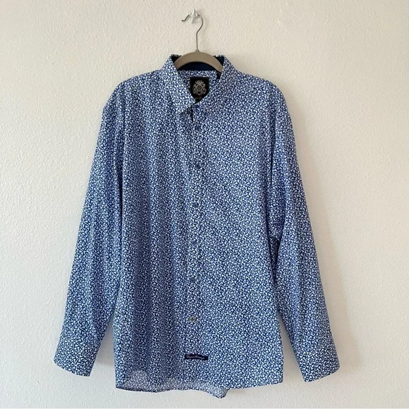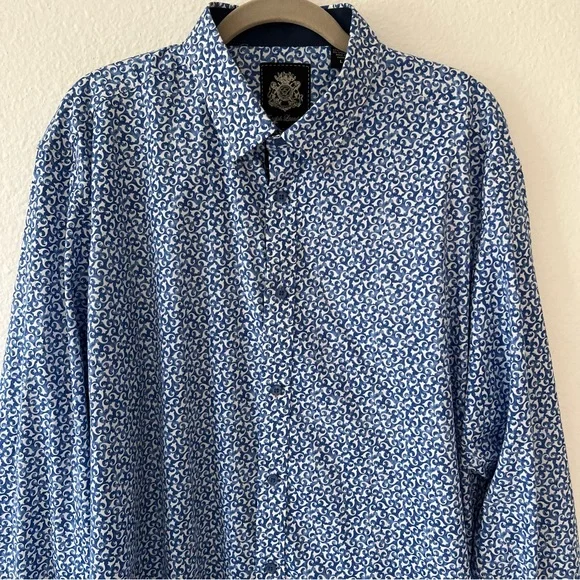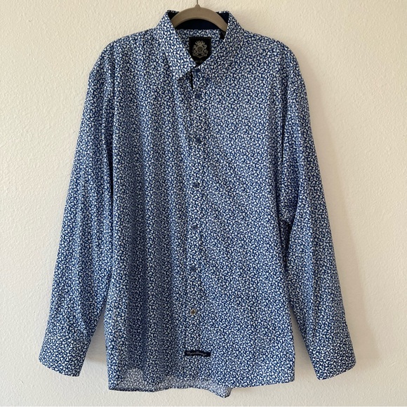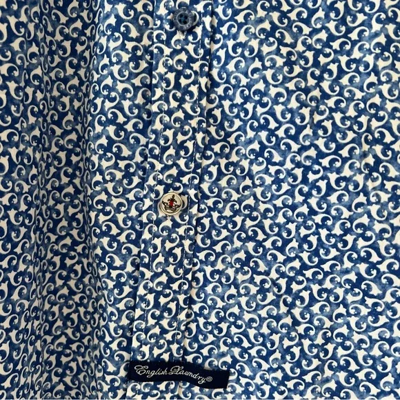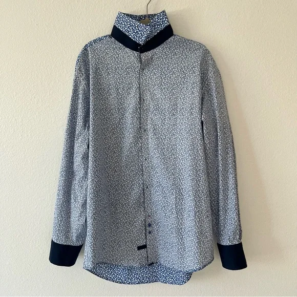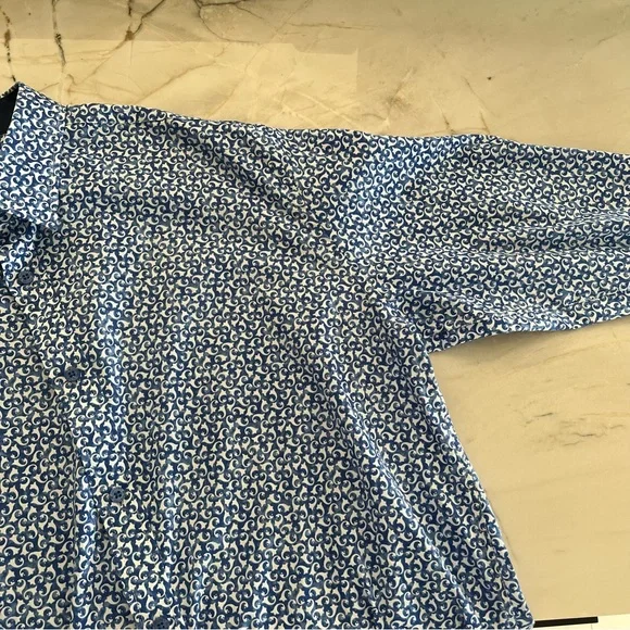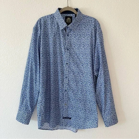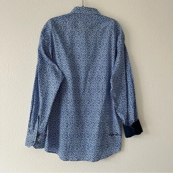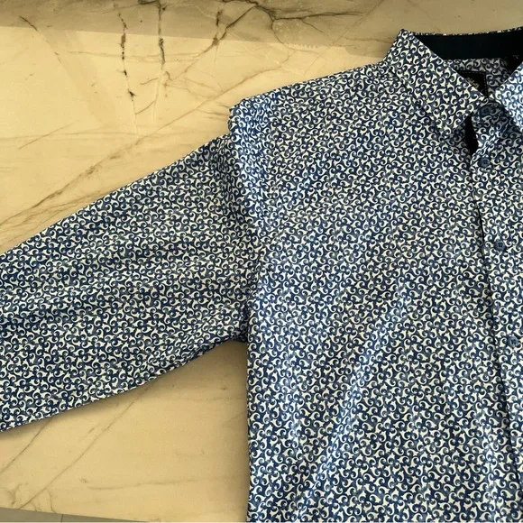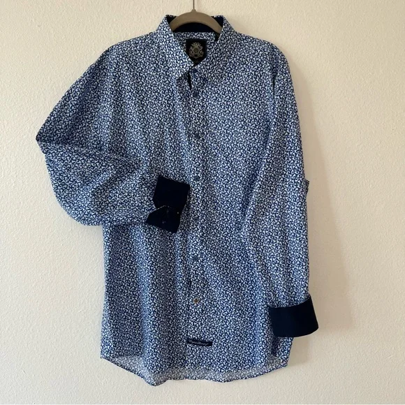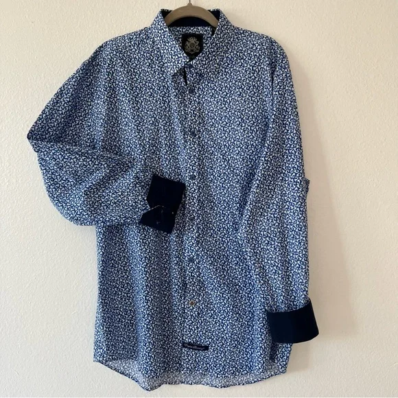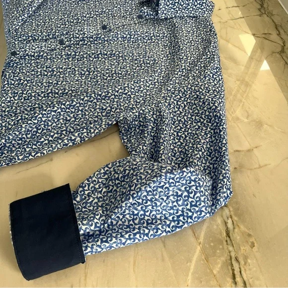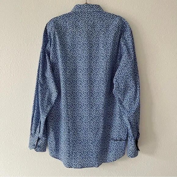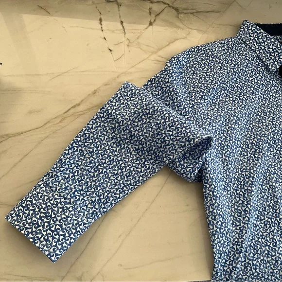 Blue button down collared shirt in with white print all-over pattern. Cuffs also include buttons & can be rolled for dark blue contrast.• 97% Cotton• 3% SpandexHas not been used, without significant flaws and in like new condition.