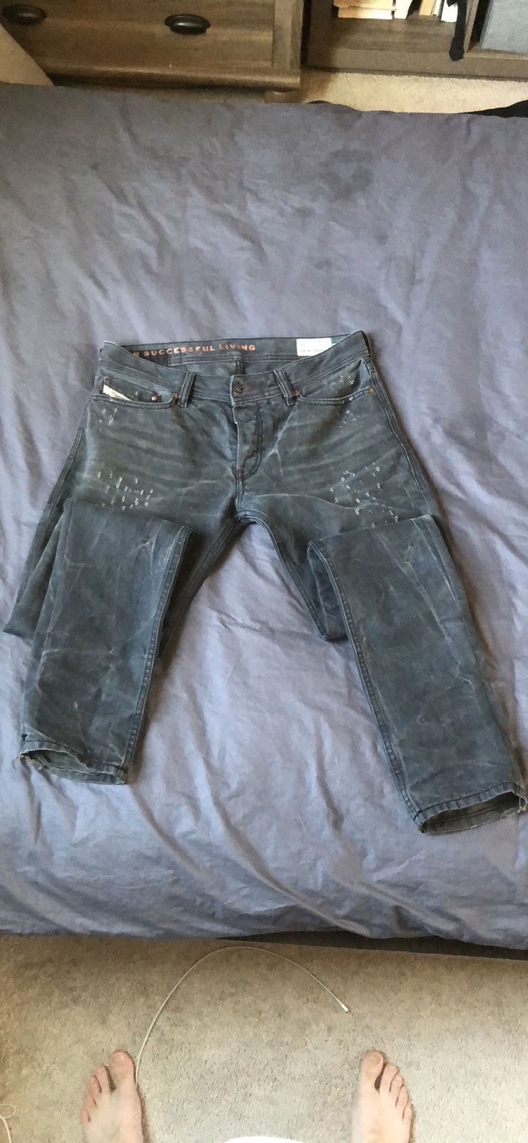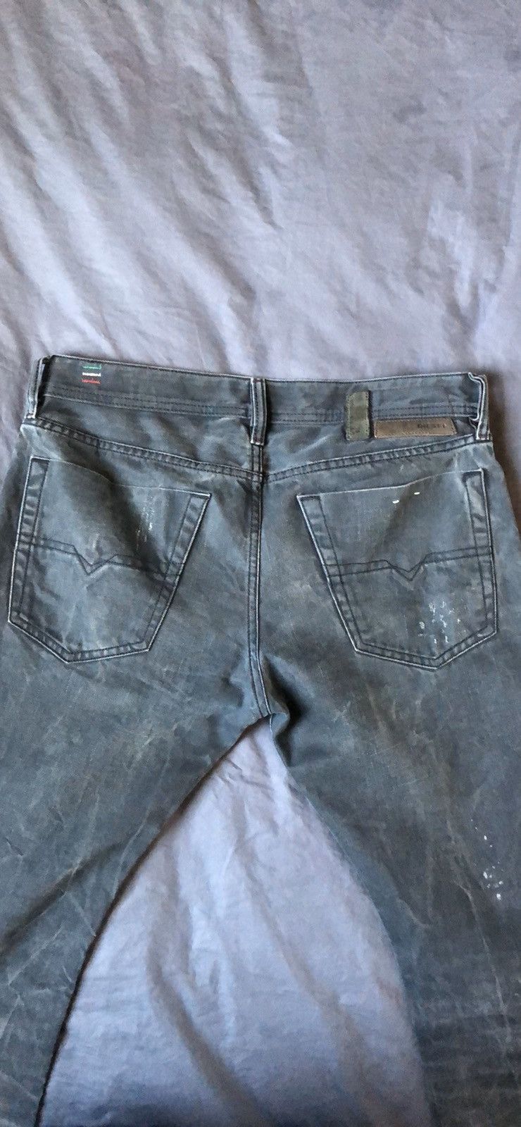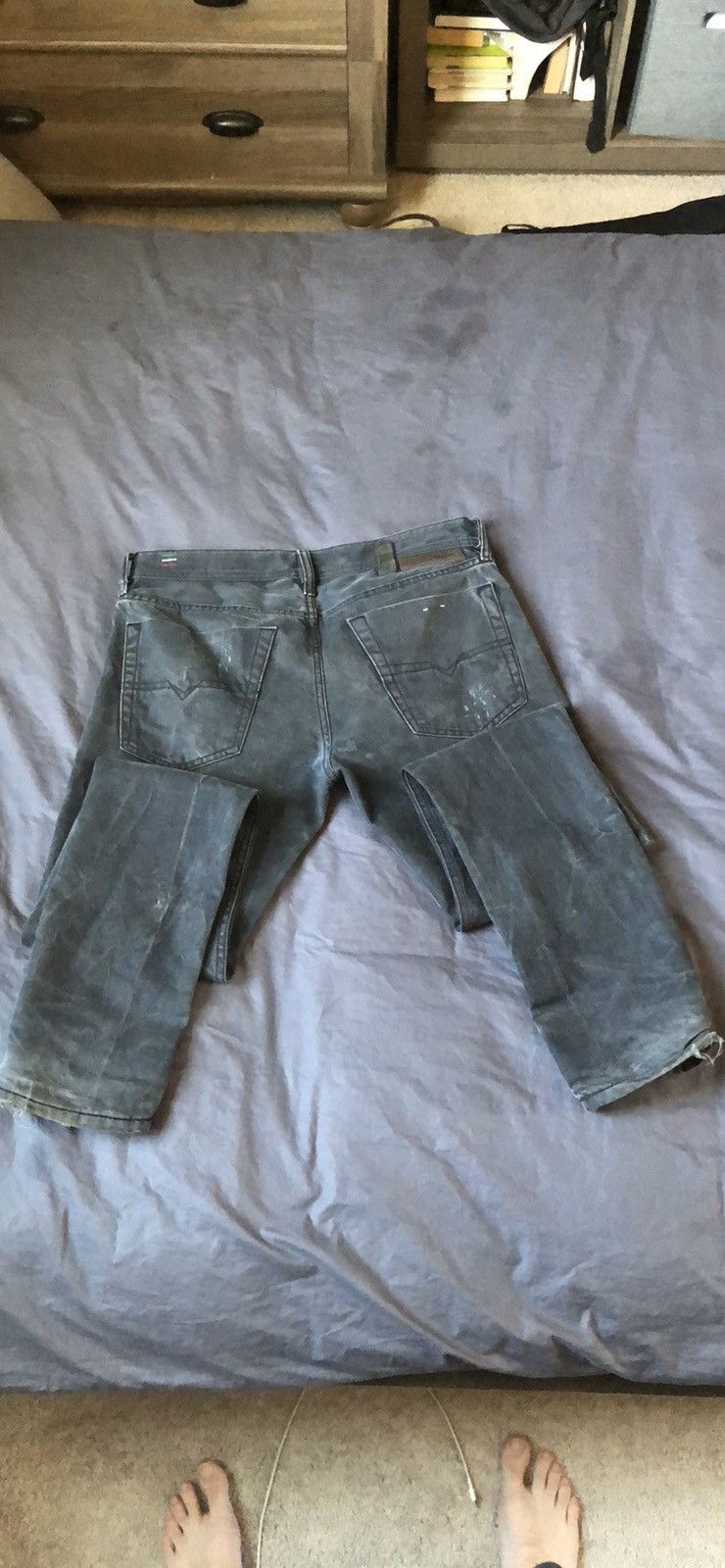 Beautiful lightly worn pair of DNA jeans. These are dark grey with a one of a kind coloring technique throughout. Paired with light distressing running about the pair. It has an amazing maroon stitching to accent the uniqueness of this pair. These have been tapered to a slim/skinny fit. Offers welcomed and questions answered!