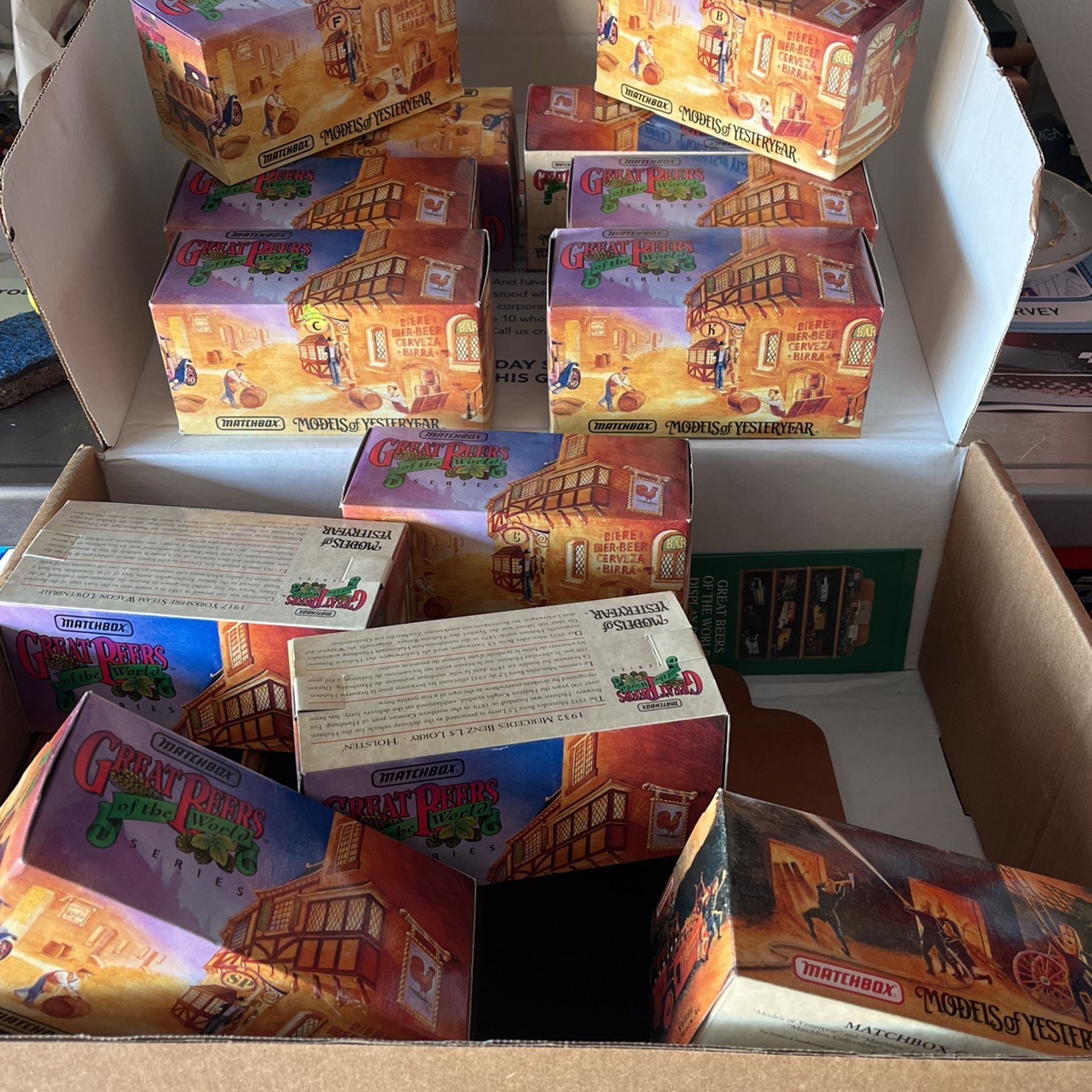 12 matchbox models of yesteryear. Great beers of the world collectionAll new in boxIncludes wall display case. Also 1 yesteryear fire truck