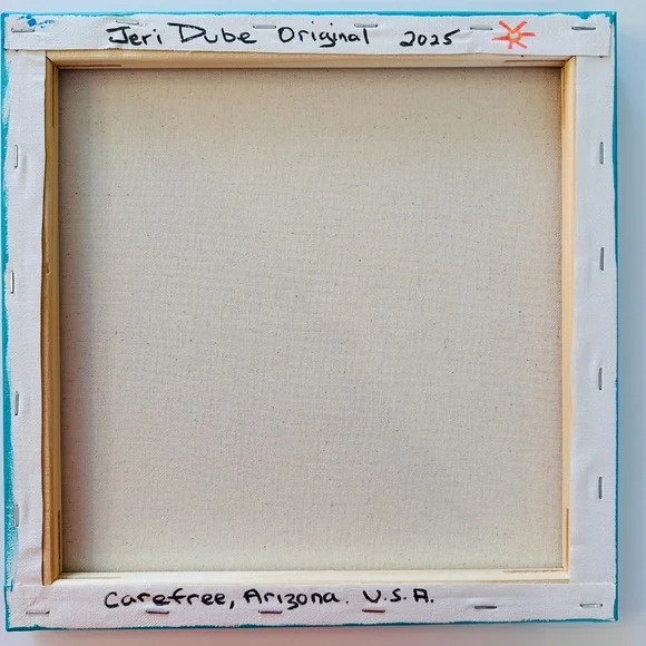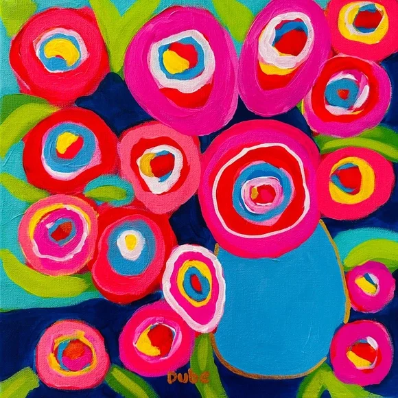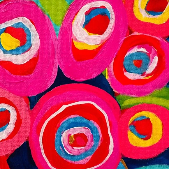 Bright, Cheery, Colorful and Happy. This original work of art is hand painted with acrylic paint on stretched canvas. For protection, it has been varnished with a glossy seal. The half-inch sides are painted.Hand Painted Original art, not a print or copy. Unframed.The photographs show the actual painting being sold, carefully packed and shipped to you.Brand new. Direct from the Artist.A wonderful way to add a POP of color to your gallery wall or any wall!
