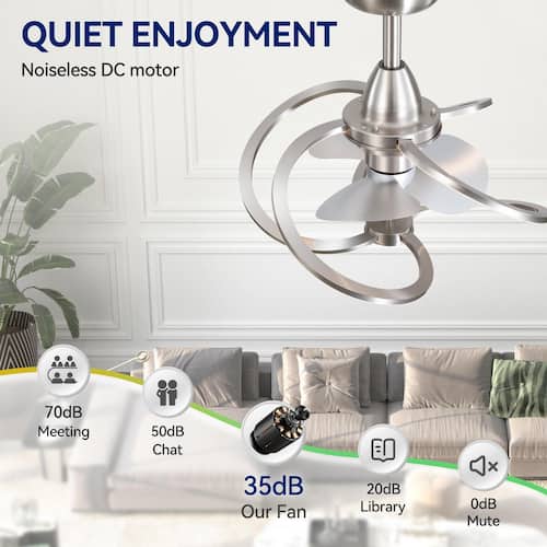 About This Product:Illuminate your room with precision and flair using the integrated LED strips, providing a warm and inviting glow at a comfortable 3000K color temperature. With the convenience of a 6-speed remote control, you can effortlessly adjust the airflow to suit your preferences, ensuring ultimate comfort year-round. Crafted for optimal performance and efficiency, this fan features 3 durable silver ABS blades powered by a reliable DC motor, delivering powerful yet whisper-quiet operation. Experience the ultimate in convenience with the added benefit of a memory function, allowing you to easily recall your preferred settings with the touch of a button. Plus, the sleek line design adds a touch of modern sophistication to any interior.