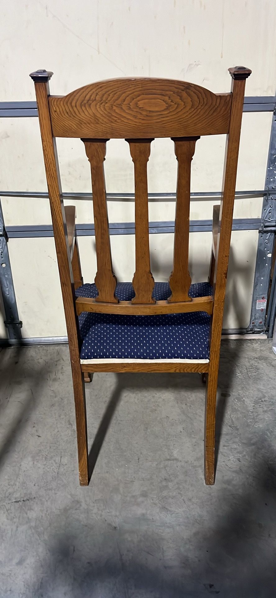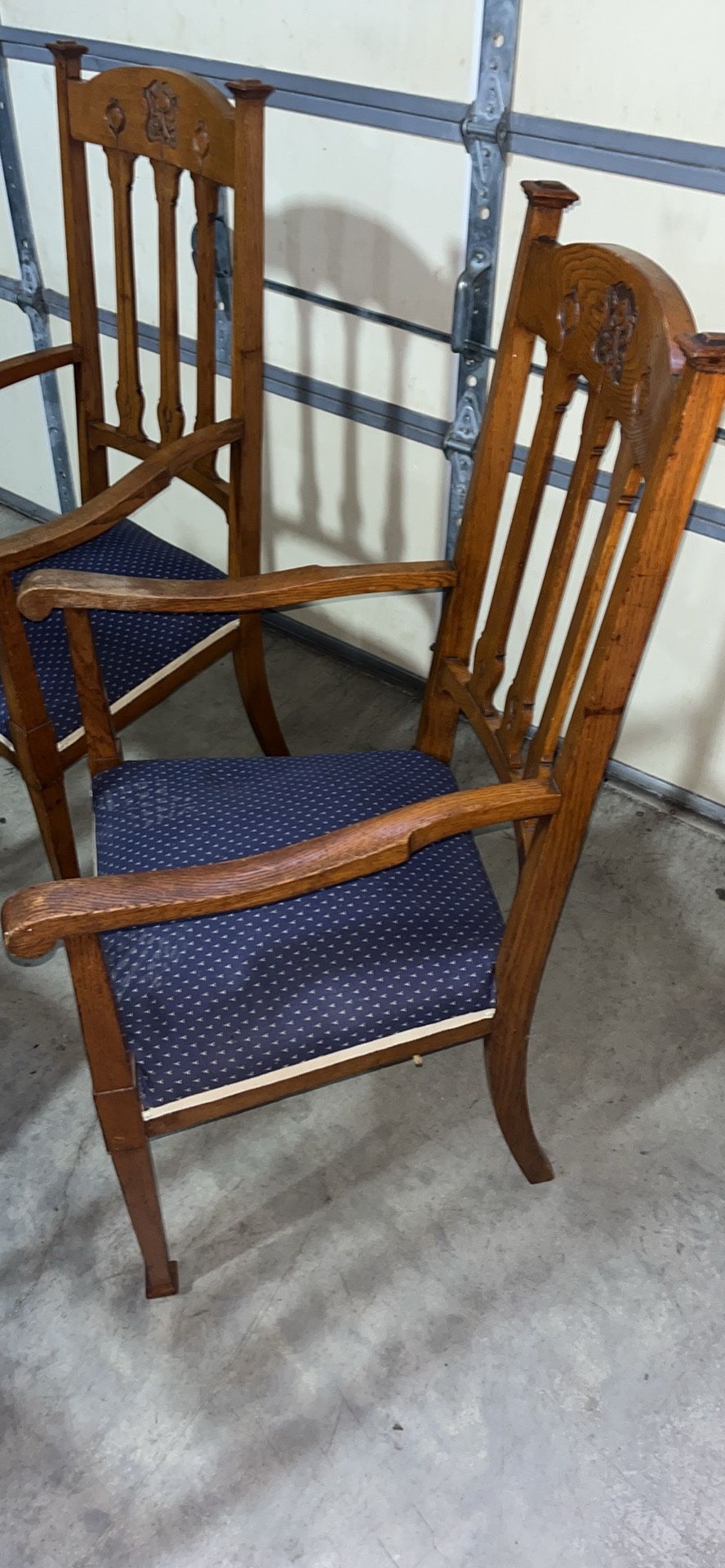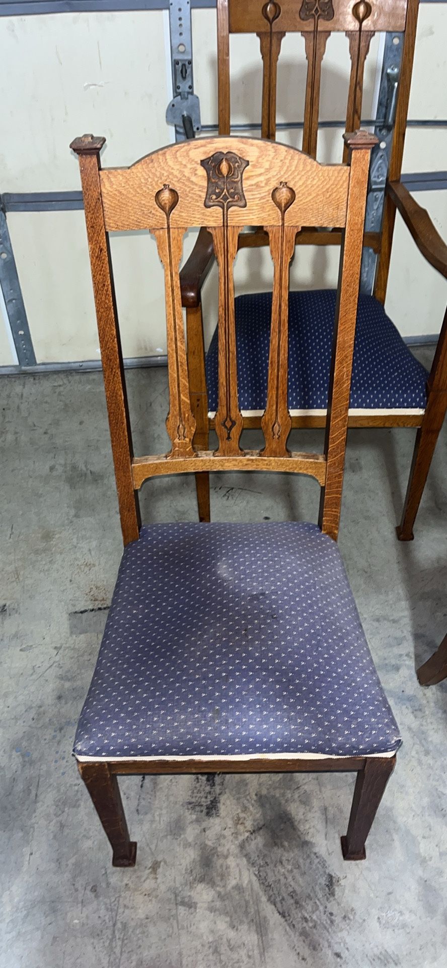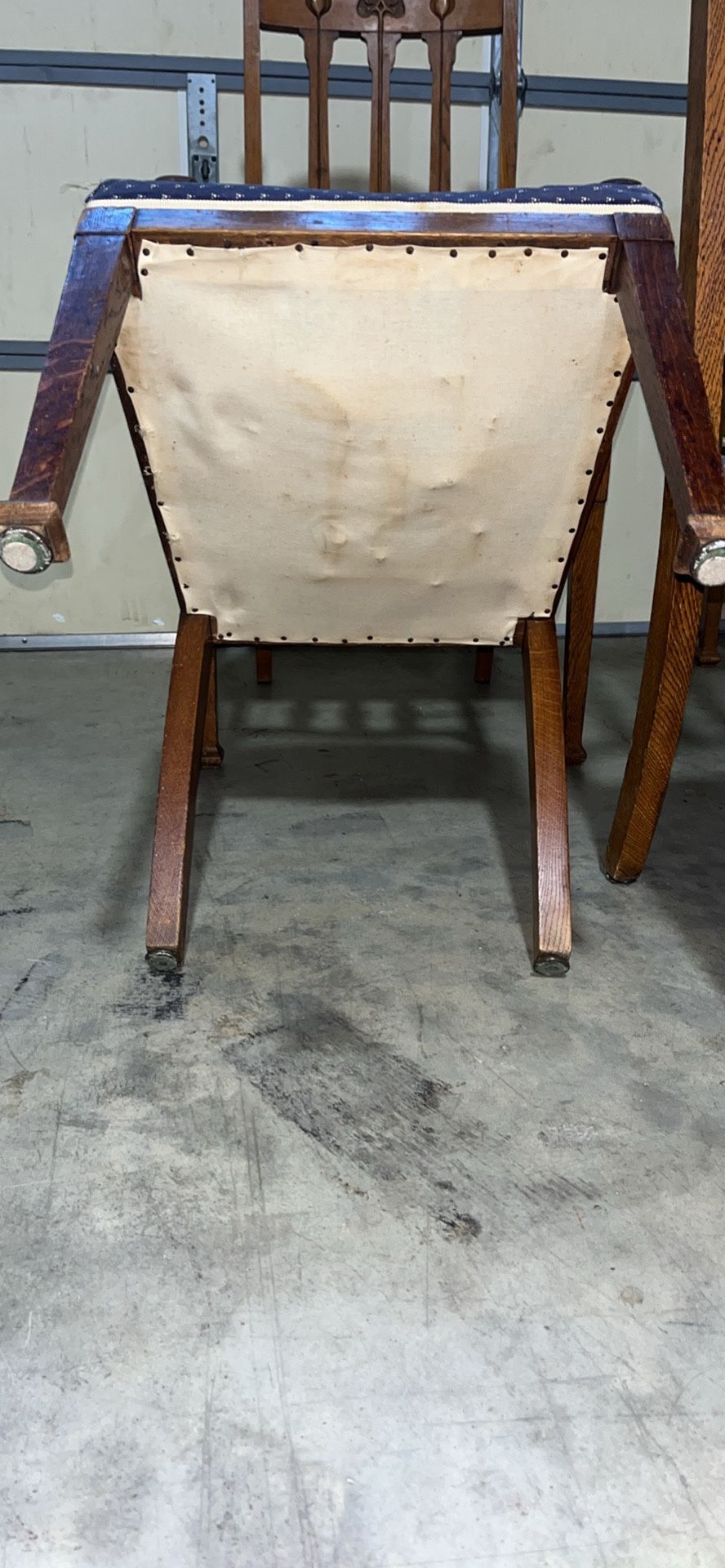 Chairs come in a set of 5. Two arm chairs and three armless chairs. They are made of solid oak wood and are in good condition. Would be a great project to repurpose or use as they are . Date on the chairs is 1933