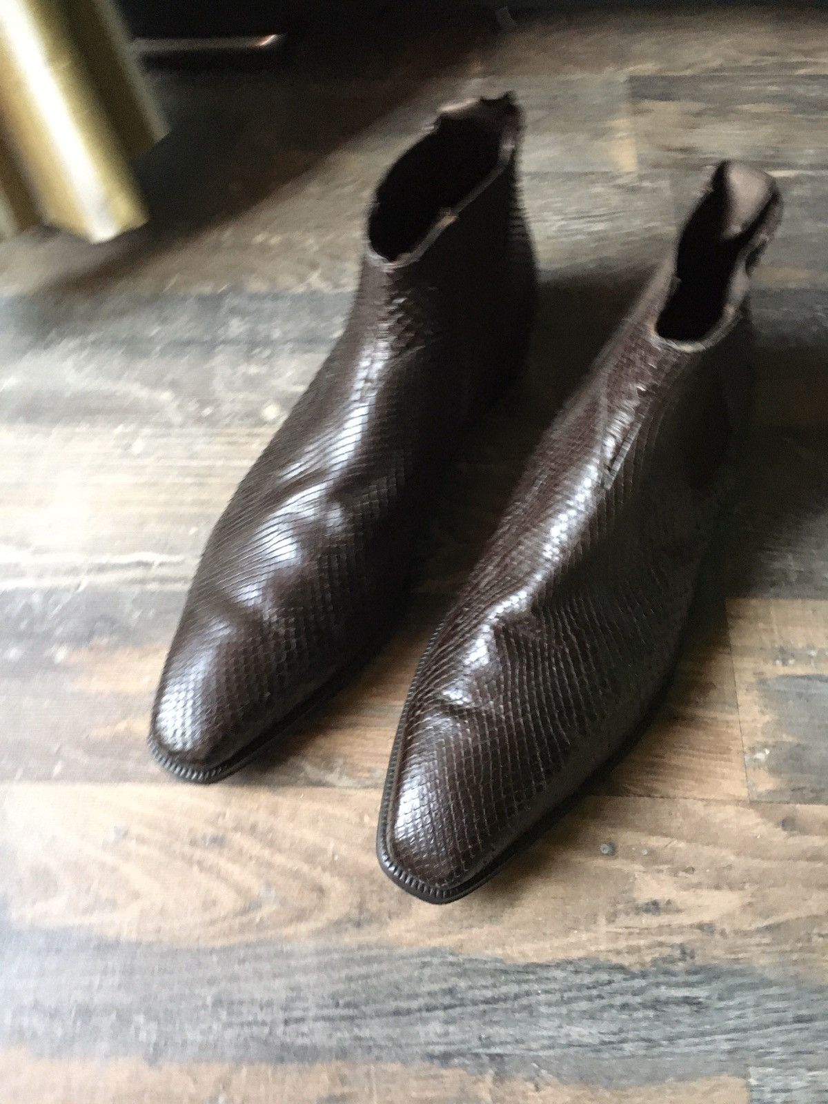 Very good cndition,beautiful dark brown,genuine lizard skin,made in italy size 9Happy to answer questionsNo refunds