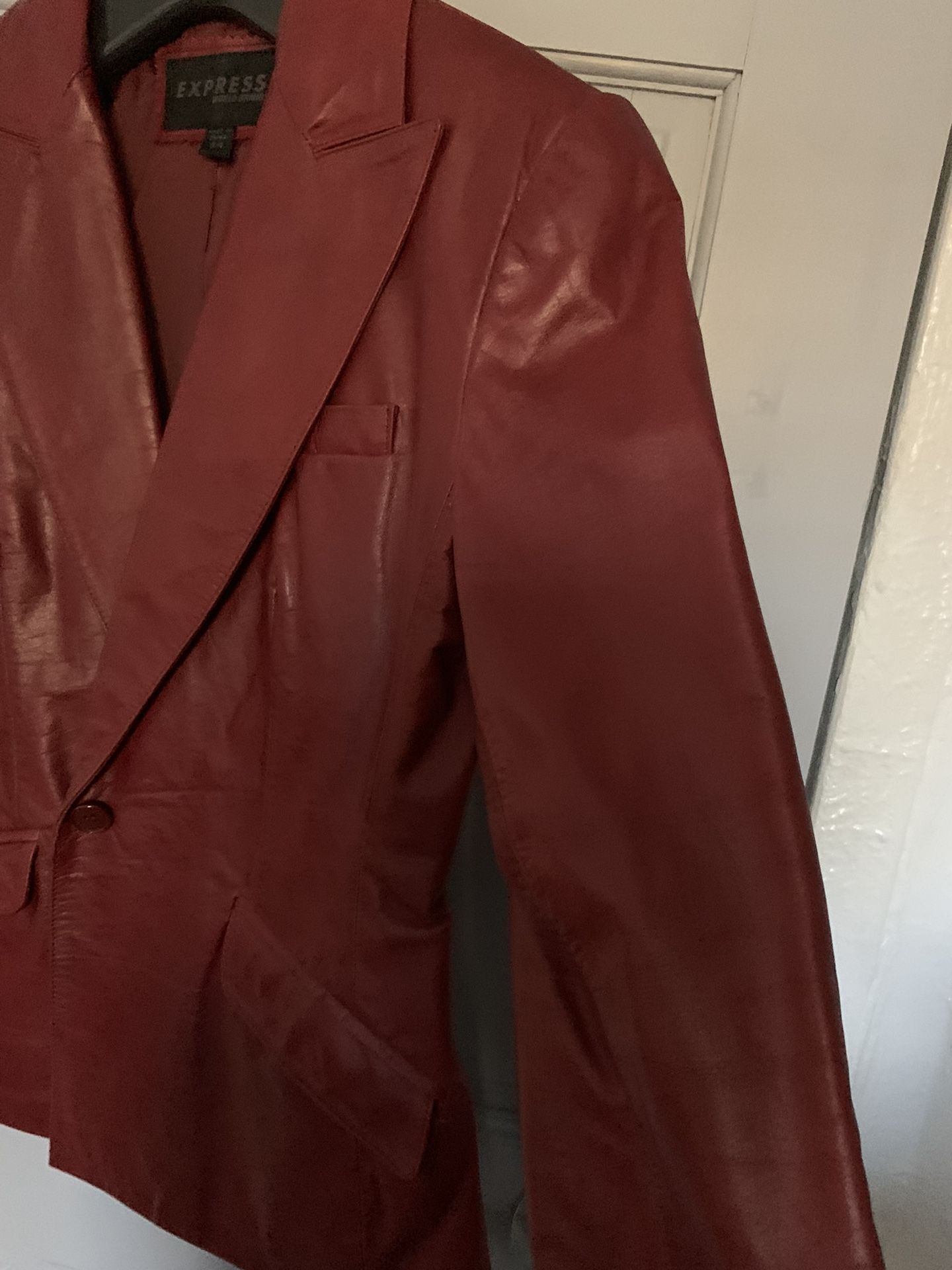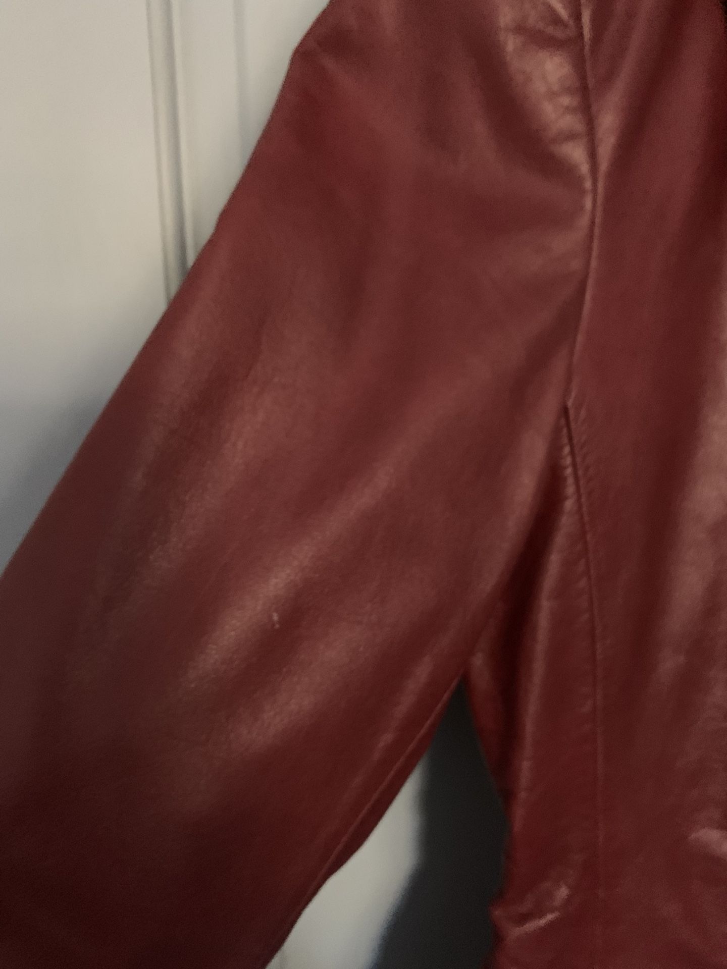 Pre-owned Good condition Please refer to photos for condition Material: 100% genuine leather shellProfessional leather clean onlyColor: RedSize: 3/4Smoke free & pet free home Price: $70.00