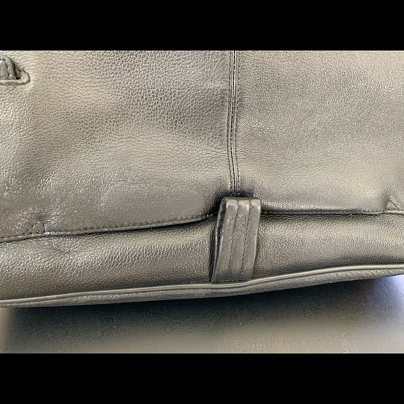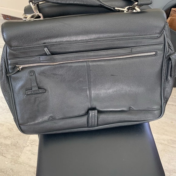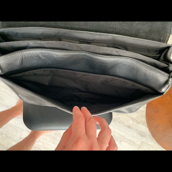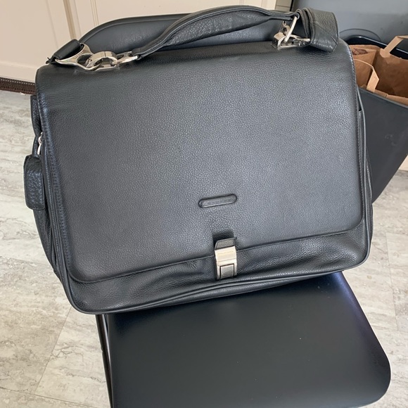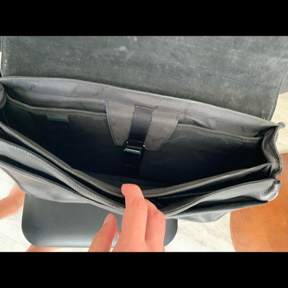 Large Piquadro briefcase in great shape. Can easily hold a laptop, charger, notebooks, etc. Small blemish on the back left side towards the bottom (as pictured). Comes with a removable should strap