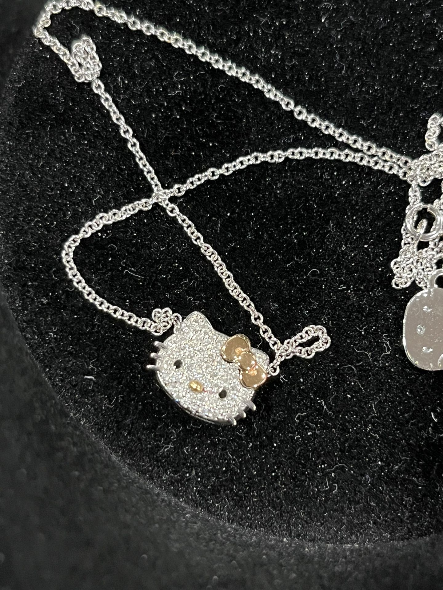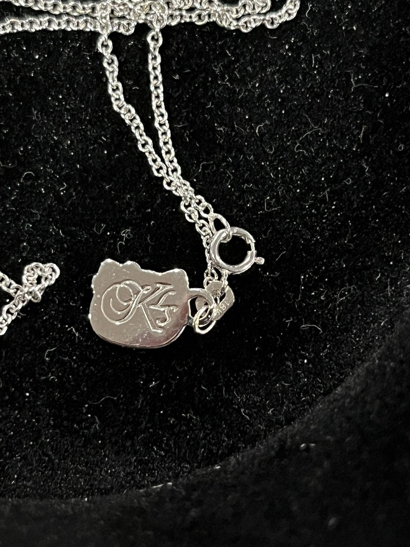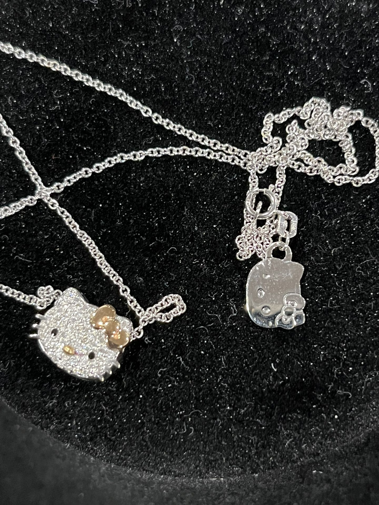 Very rare Vintage Mid 2000s Hello Kitty 18kt white gold / diamond pendant necklace set KLS X Sanrio collab Kimora Lee Simmons designs Limited pieces This necklace set is in excellent condition like new comes in original dust bag 1000% authentic 18k white gold with rose gold bow and diamonds on pendant Chain is adjustable in length and solid 18kt white gold Real 18kt white gold NOT PLATED and genuine diamonds NOT MOSSANAITE or LABCan meet at jeweler to test *this is a vintage jewelry piece from a older Sanrio collection . It is highly collectible and sought after . Not selling as scrap gold so not interested in those offers
