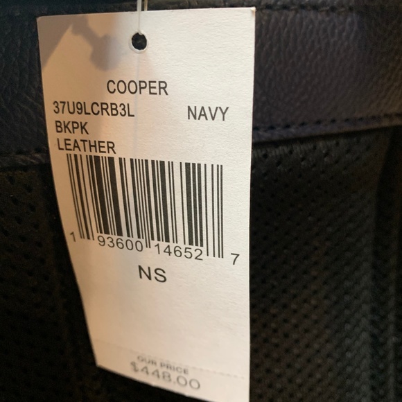 MK Leather Navy Cooper BackpackBRAND NEW WITH TAGS!!!GUARANTEED AUTHENTIC!!!DETAILS-100% Cow Leather -Gunmetal Hardware -Top Handle: 2.5" -Adjustable Strap: 5"-15" -Exterior: Front Zip Pocket -Interior: One Zip Pocket, Hidden Tablet Sleeve -Zip Fastening -Interior Lining: 55.5% Polyester/44.5% Cotton -11" X 16" X 5" Style No: 37u9lcrb3lALL SALES FINALREASONABLE OFFERS ACCEPTED, NO TRADES