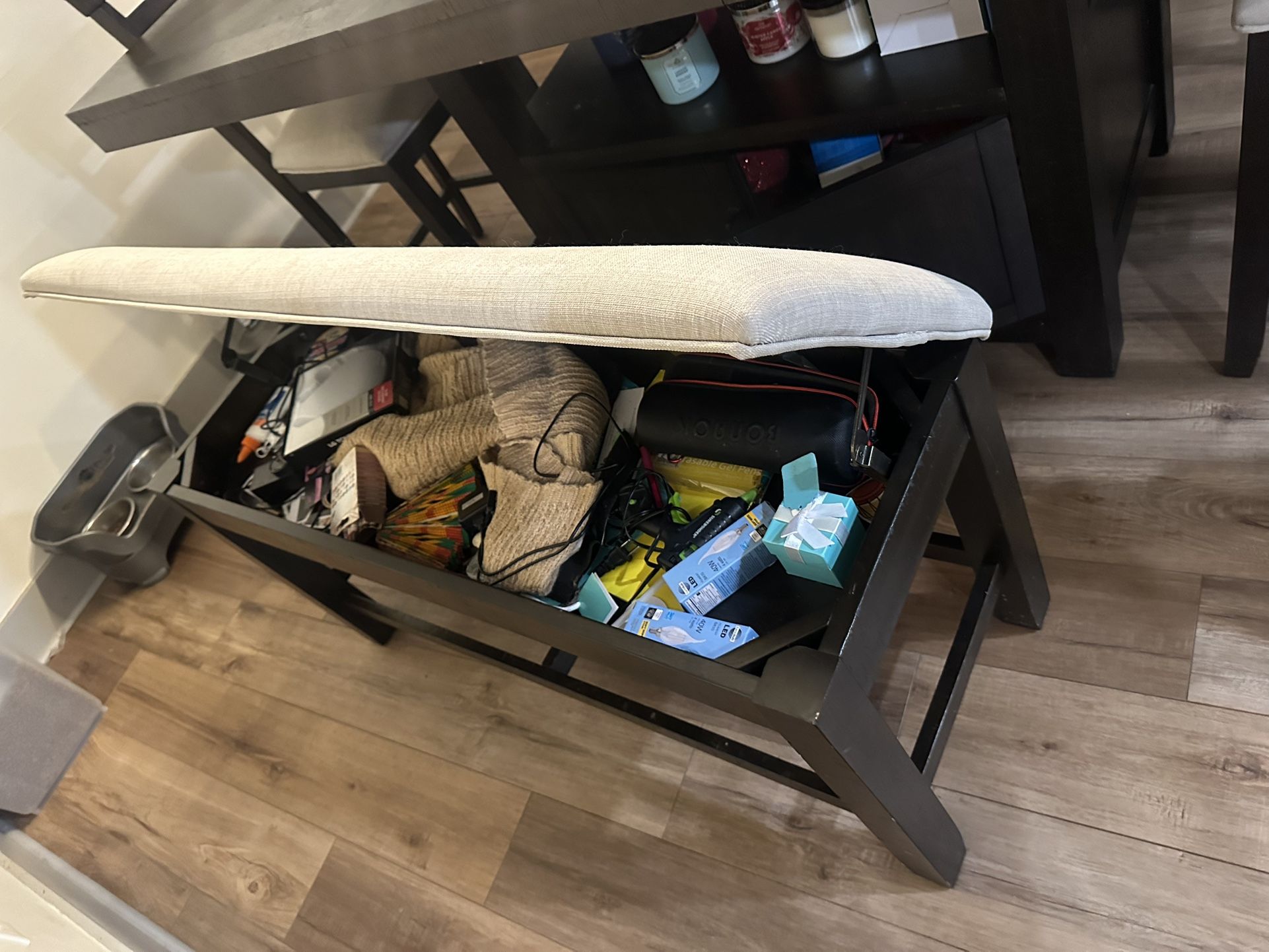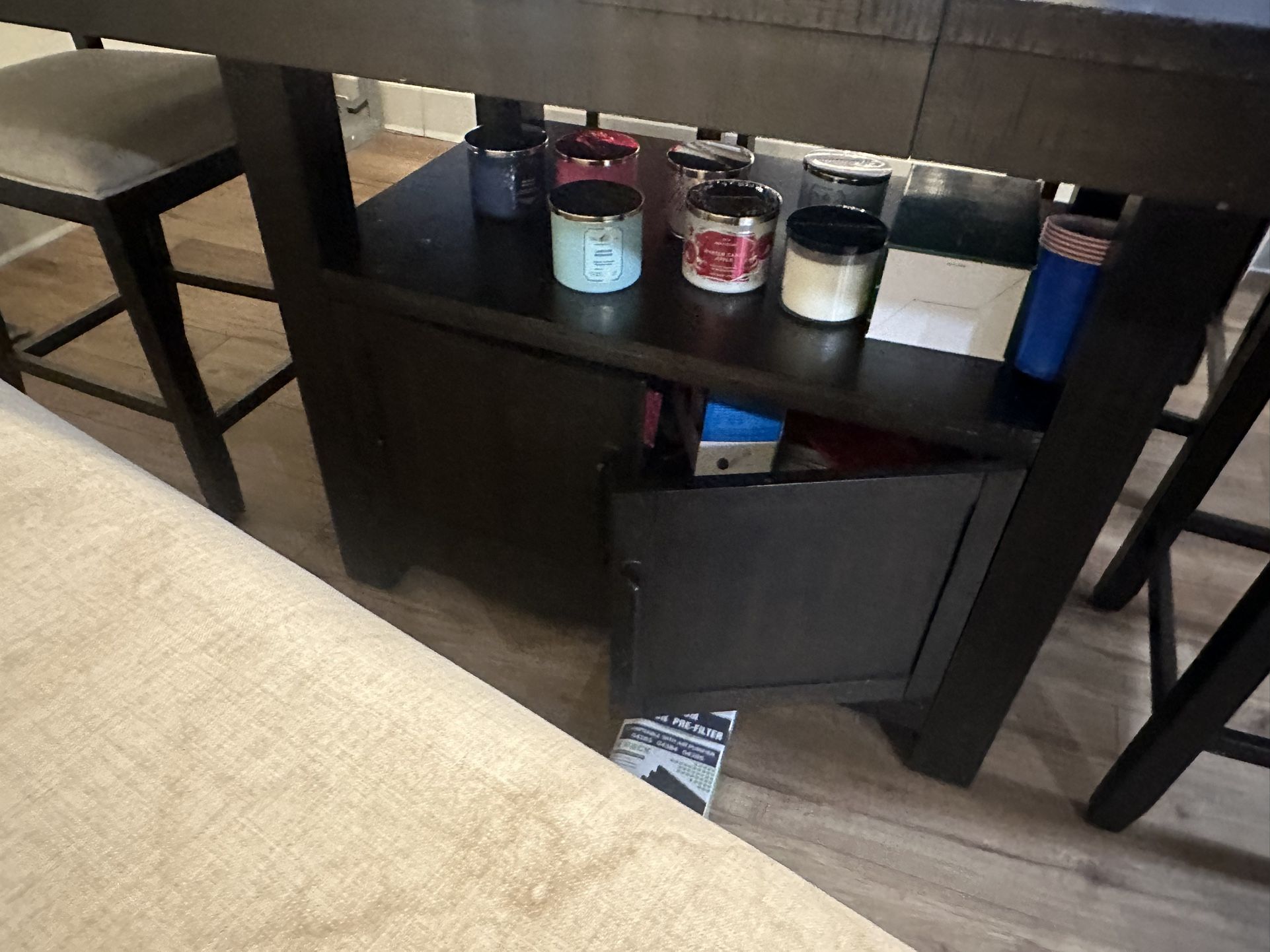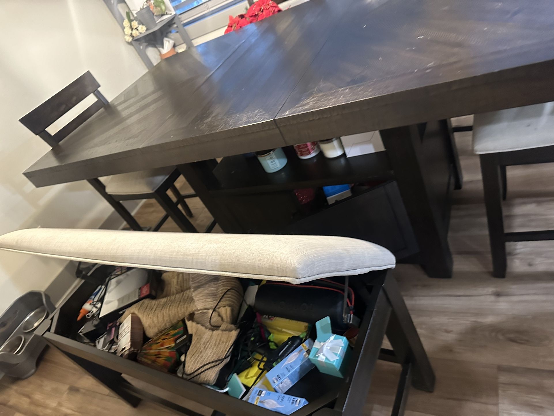 Dining table with 4 chairs and a bench that sits 2. The bench opens up for storage, the fabric needs replacing. Dining table has bottom cabinet storage. Table has water damage areas where it bubbled up.