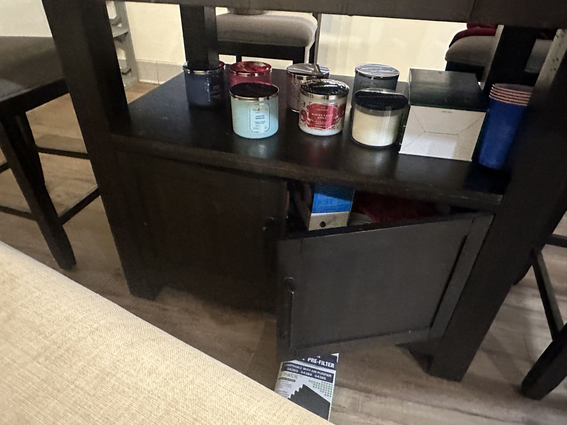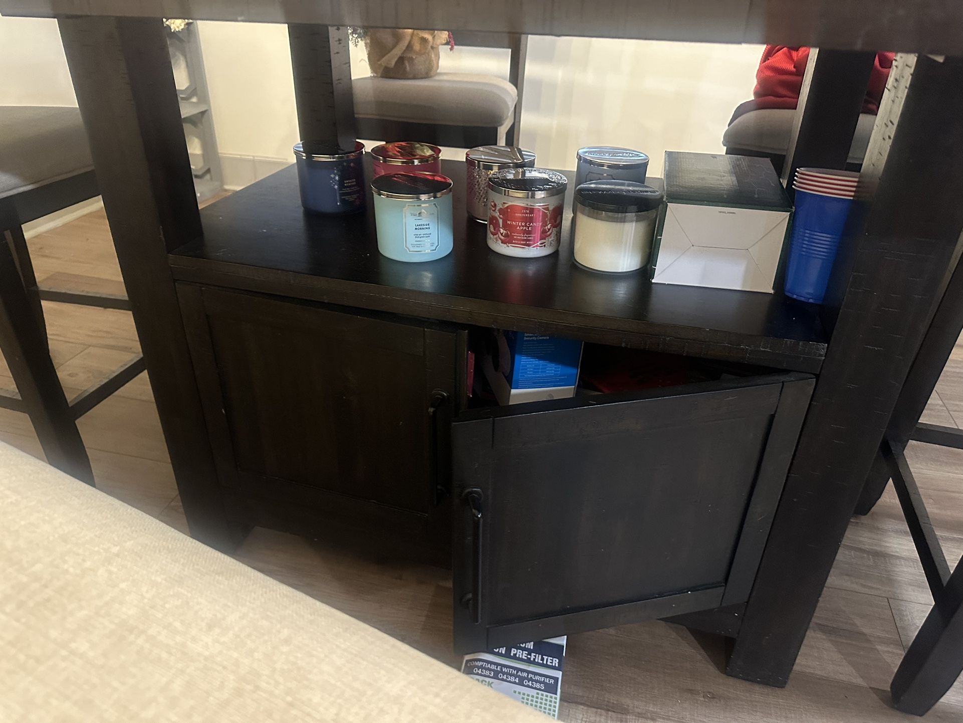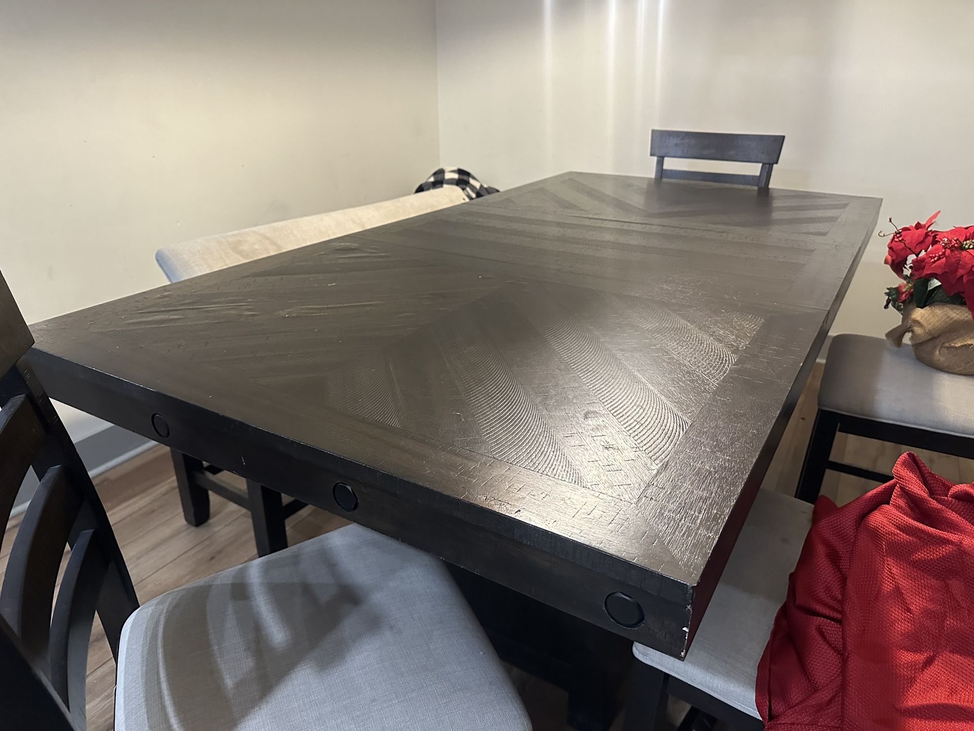 Dining table with 4 chairs and a bench that sits 2. The bench opens up for storage, the fabric needs replacing. Dining table has bottom cabinet storage. Table has water damage areas where it bubbled up.