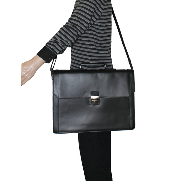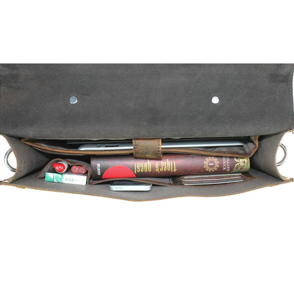 External dimension: 18 * 13 * 3", weight 4.6 lb. Internal laptop cushion pocket 16 * 11"Internal main compartment dimension 16 * 12.5"; strap length 56"Internal phone, notebook holder and card slotsReinforced latch lock closure, back zipper pocket, full grain leather, top layer cowhide leather