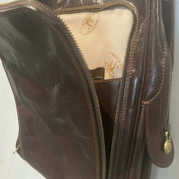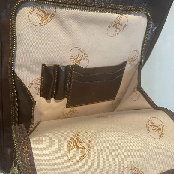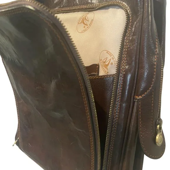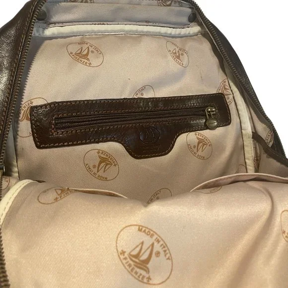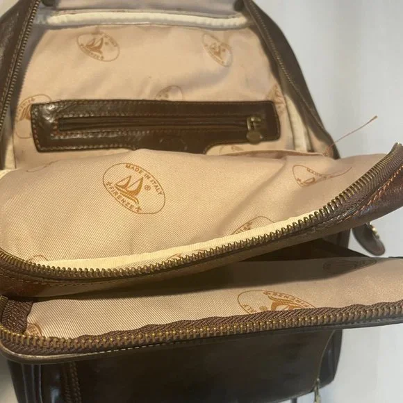 Milano Pack is a lightweight leather backpack made with full grain leather and finished with brass or stainless hardware. The calfskin leather for this backpack was vegetable tanned in Tuscany to create rich color tones while the semi gloss finish helps prevent stains. Over time this leather backpack will soften and develop a beautiful patina. Our 8 oz cotton duck canvas lining is made in South Carolina and very durable. The combination of Italian vegetable tanned leather, Italian craftsmanship, and U.S. made canvas lining make our leather backpacks beautiful, durable, and lightweight. The Milano backpack is available in Vecchio Brown, Olive (Honey) Brown, and Black. Made in Italy.More Info here: https://www.floto.com/products/leather-backpack-milano• 14" h x 10" w x 4" l• 8" x 12" Gusset Pocket• Full Grain Hand Stained Leather• 3 Card Holders, 2 Pen Holders, Inside Zip Pocket• Floto Stripe Canvas Interior• Brass or Stainless Steel YKK Zipper and Hardware• Lightweight: 2.0 pounds