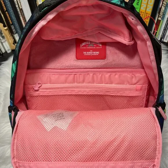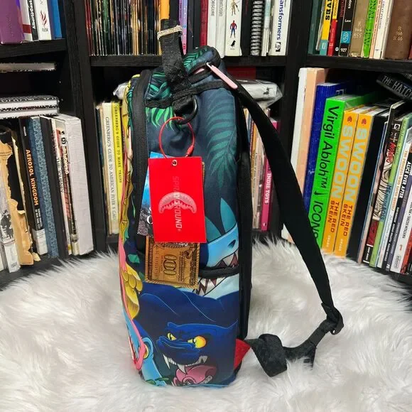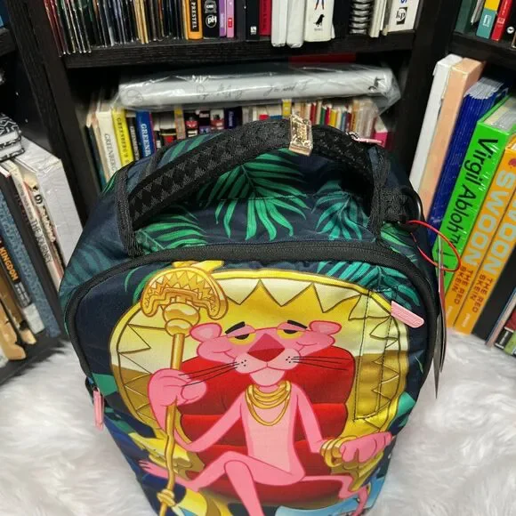 "BRAND NEW"SPRAYGROUND X PINK PANTHER HEAVY LIES THE CROWN BACKPACKPRODUCT DETAILSExteriorDimensions: 18" x 6" x 11.5" • Front zipper pocket • Side pockets • Zippered Stash pocket • Separate velour sunglass compartment • Ergonomic mesh back padding • Adjustable Straps for custom sizing • Gold zippers with metal hardware • Metal "Sprayground Authentic" badge • Slide through back sleeve connects to carry-on luggage to free your handsInteriorSeparate velour laptop compartment • Mesh organizer pocketFabric900D Polyester Fabric