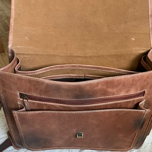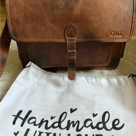 There is a scratch but not deep and no hole,He just used this 3 times.It’s normal sign of ware and in good condition,There is a Initial but in overall is a good conditon. With dust bag.* Full grain buffalo leather* Antique brass hardware and Padded Laptop compartment with soft lining.