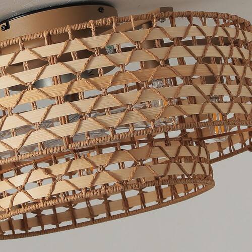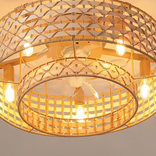 About This Product:Our 19.69 in. ceiling fan draws inspiration from bohemian aesthetics with a hand-woven paper rope caged shade. Its design is reminiscent of a tranquil tropical summer retreat and works equally well on an indoor porch or covered patio. The fan adds a soft ambiance to your space by supporting up to 5 E12 base bulbs (bulbs not included) while cooling your surroundings. Combining functionality with timeless beauty, this compact fan effortlessly blends natural elements with modern design, making it an ideal choice for those looking for something unique and stylish.