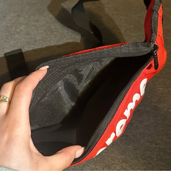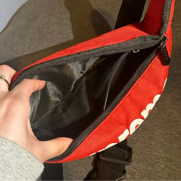Rare Supreme Waist Bag with functionality and style.The Supreme waist bag features two pockets on the front. The front pocket has a zip closure, an embossed Supreme logo with white lining, Slightly above the front pocket is the main compartment, also secured by a zip.It opens to a spacious storage unit with soft nylon dividers to help organize the bag´s contents.The waist strap of this carry-on is embellished by a plastic clasp and metallic joins that allow for easy length adjustment. Its red with a nylon exterior.Had it for a while and got it from a friend, but I have no use for it, so i decided to sell it.