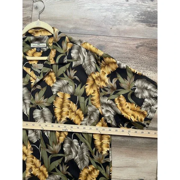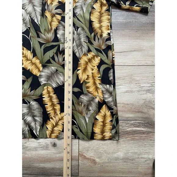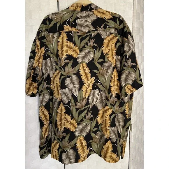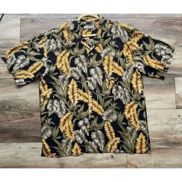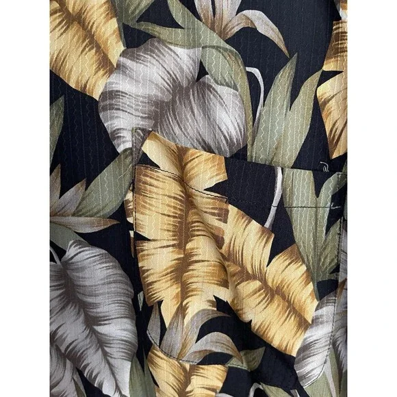 Get ready to impress with this stunning Tommy Bahama button-up shirt. The black, green, and yellow floral pattern is perfect for a casual occasion, and the short sleeves make it ideal for summer. The shirt features a collared neckline and wooden buttons for a stylish and comfortable fit. This regular-sized shirt is made of 100% silk, with accents that include buttons for added detail. The Orchid Illusions model is part of the Summer Comfort product line, and it is perfect for men who want to look their best without sacrificing comfort. The shirt is suitable for a variety of occasions, including casual outings and even vacations. Add this shirt to your wardrobe today and enjoy the benefits of a high-quality, stylish button-up shirt.