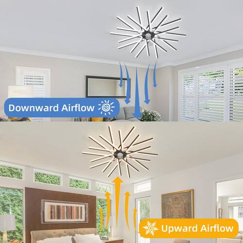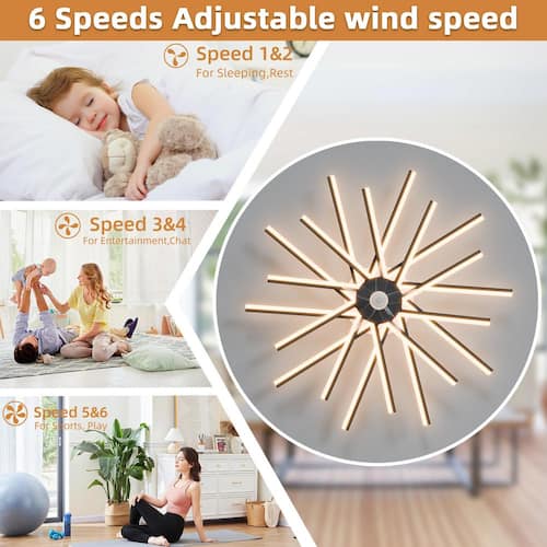 About This Product:The creative design endows the ceiling lamp with modern and fashionable elements, giving the overall feeling of simplicity and non monotony. The ceiling lamp and fan not only provide practicality, but also add a different feeling to the decoration of the room. The combination of lighting and fan allows you to use 2-functions at the same time. Can be used for both lighting and cooling. The fan has 6-speed options, each speed 3-colors (white light, neutral light and warm light), which can be switched at will and the brightness can be adjusted at will to create different living atmosphere for your room. The remote control or APP control allows you to control the switch of the fan and light freely on the sofa or bed.