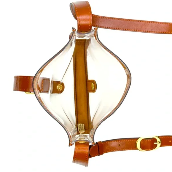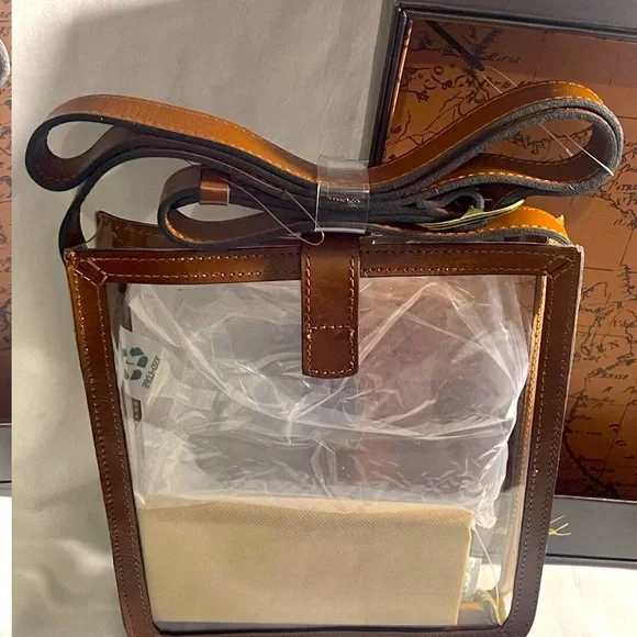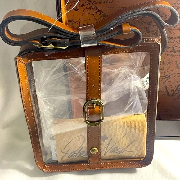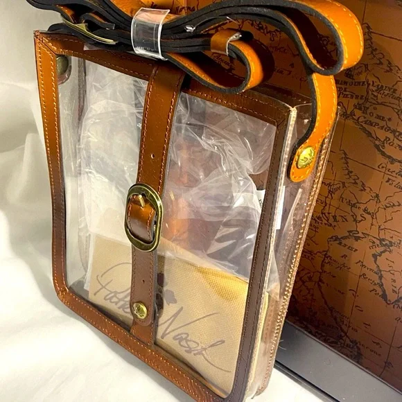 Unique clear crossbody messenger bag by Patricia Nash. Crafted in rich brown leather. Features a classic buckle detail.Patricia Nash Clear Crossbody Purse PVC BrownLeather Trim Without CC Wallet NEW