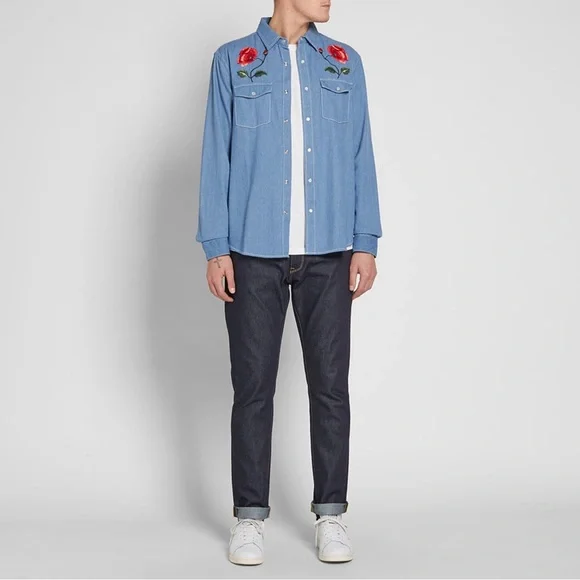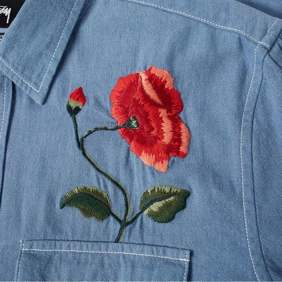 Amazing condition of stussy denim embroidered shirt. No stains or tears on the shirt. The embroidery looks pristine and the garment is 100% cotton. Feel free to send an offer