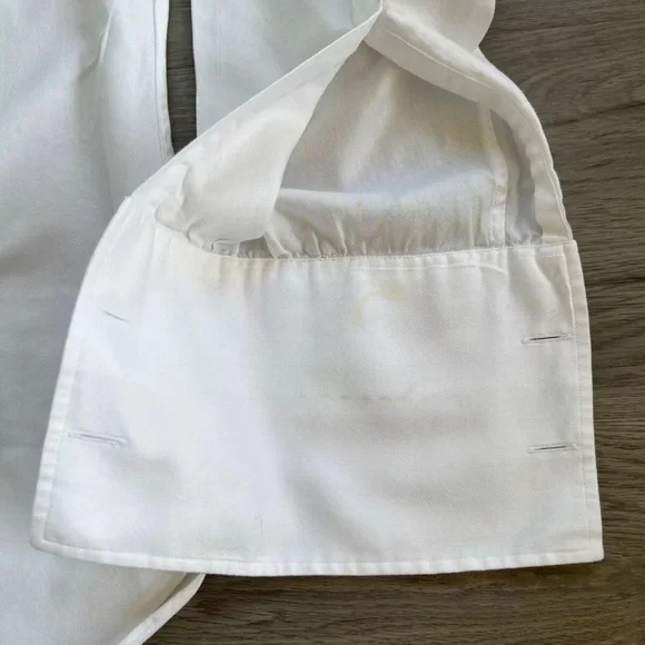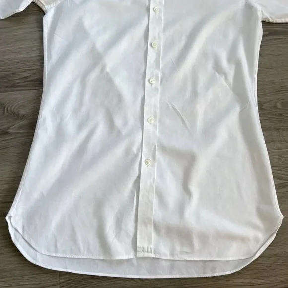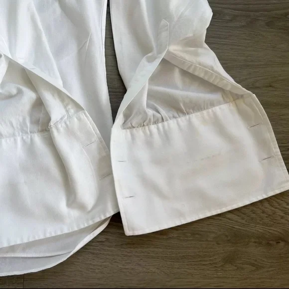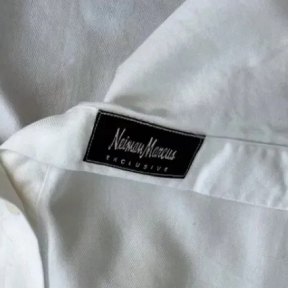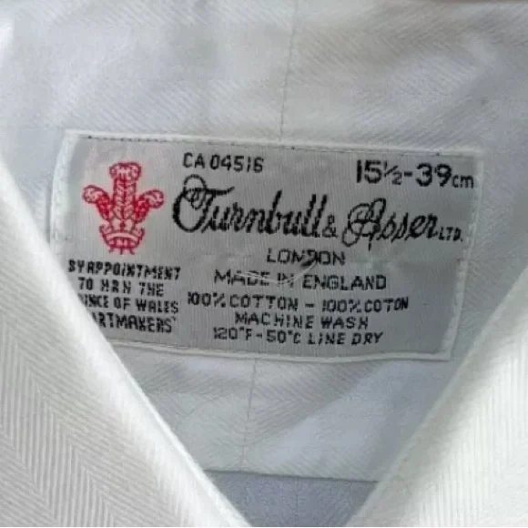 Classic white Turnbull & Asser dress shirt with French cuffs. Neiman Marcus exclusive.15.5" 39 sizing. There are some slight stains on the left cuff, please see the photos. Pit to pit 21”Shoulder 17.5”Sleeve 25”Length excluding collar 35”