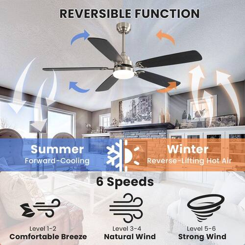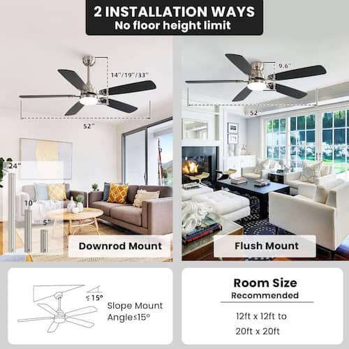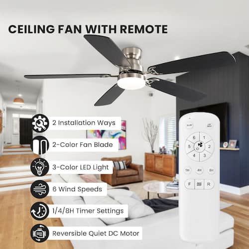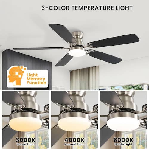 About This Product:The CACI Mall 52 in. Ceiling Fan with Light & Remote: Control all operations remotely, including 6 wind speeds and 3 light colors (3000K/4000K/6000K). Features 1/4/8-hour sleep shutdown and a remote wall bracket. Its powerful, ultra-quiet DC motor delivers up to 4800 CFM airflow while reducing electricity costs by 70% compared to AC motors. It supports multiple mounting options (flush, downrod with 5"/10"/24" rods, slope ≤15°). The reverse airflow function adjusts blade direction seasonally for cooling in summer and warm air circulation in winter. Features dual-color blades to suit your home styles, ideal for indoor spaces like bedrooms, living rooms, kitchens, or offices.
