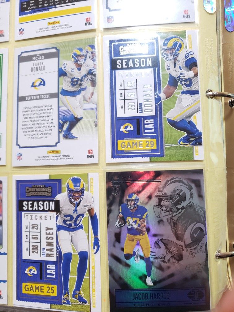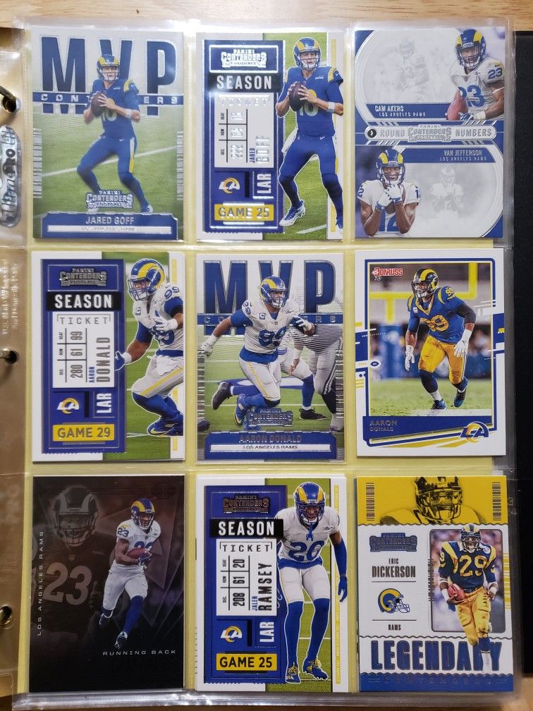 Aaron Donald x4Matthew Stafford x2Cam Akers x1.5Van Jefferson x1.5Cooper Kupp x2Robert Woods x1Jacob Harris x1Jalen Ramsey x2Eric Dickerson x1Jared Goff x2Excellent condition. Freshly pulled straight into penny sleeves.Pickup at Shaw and Maple.Words super bowl champions afc nfc champ mvp panini contenders 2020 2021 rookie illusion next up rc donruss playbook auto jersey patch limited prizm optic helmet pigskin mahomes tom brady aaron allen josh dak prescott diggs kelce rob gronk herbert burrow joe 49er jimmy bengals san francisco chiefs kansas city adams stafford cam donald van legend montana rice barry emmitt troy jim john marino elway bo jackson moss deion sanders kyler david derek raiders evans mike ring psa 9 10 bgs black label 9.5 8 las vegas chargers