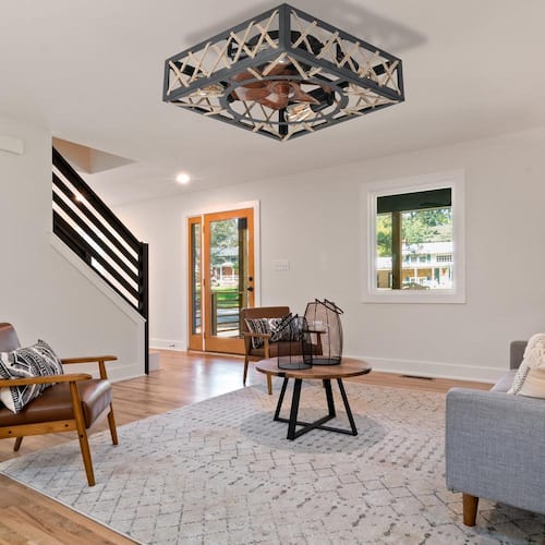 About This Product:This square ceiling fan light is the perfect combination of style and functionality. Its unique design not only enhances the beauty of your living space, but also ensures optimal lighting and cooling functions. The reversible mechanism provides year-round comfort, allowing you to easily switch the direction of the blades to meet your needs in both Summer and winter. This fan is perfect for offices, bedrooms, living rooms, and more. The fan´s sleek and modern design makes it a perfect accent to any home decor, adding both style and comfort to your living space.