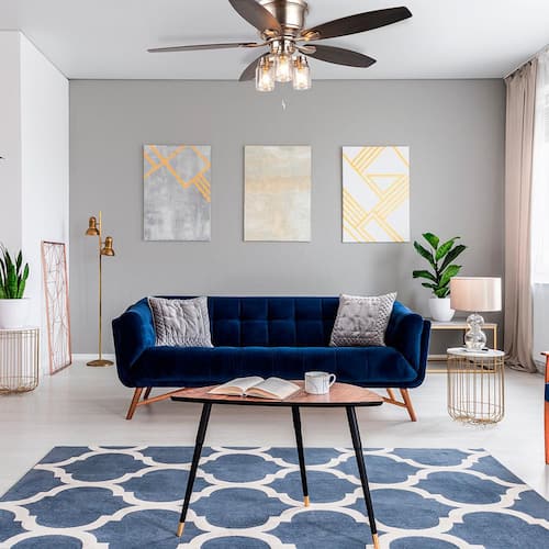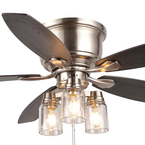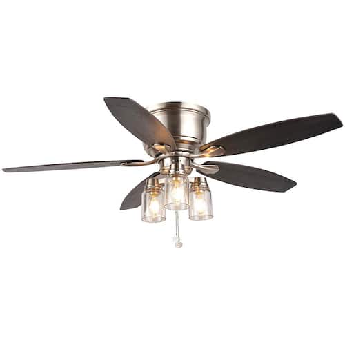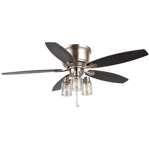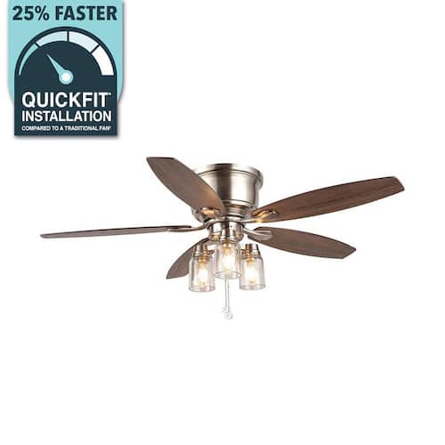 About This Product:Enhance your home interior with this Hampton Bay Stoneridge 52-in. ceiling fan. The hugger design makes this damp-rated fan great for large rooms with low ceilings. For fast assembly, it comes with a QuickInstall slide-on mounting bracket and QuickFit blades. Five reversible antique wood and seasoned wood blades add visual appeal. A light kit with canning-style glass jars and one 6.5-watt LED bulb lets you customize your lighting.