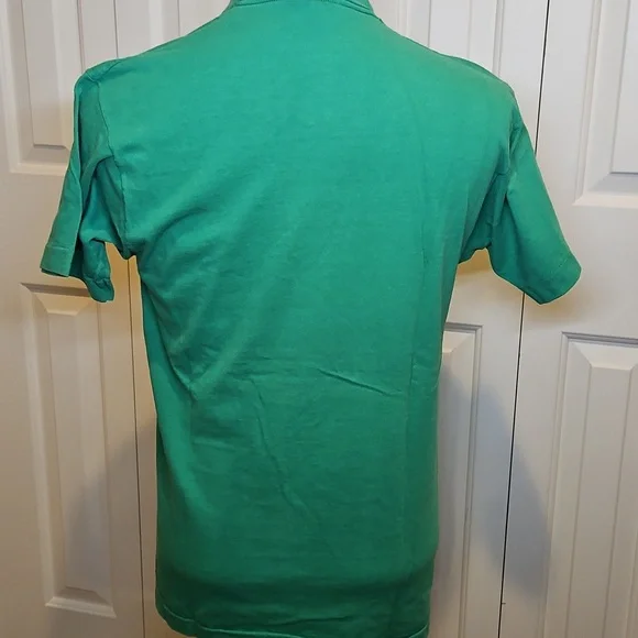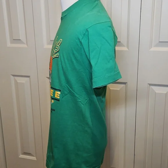 Green Milwaukee Bucks graphic t-shirt with basketball and hoop design. 1990. vintage.size Large 100% cotton. white marking on bottom front side or shirt, see picture.
