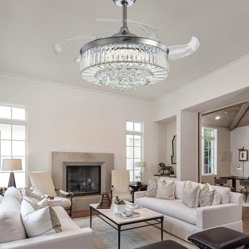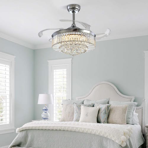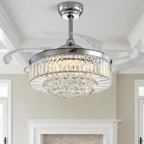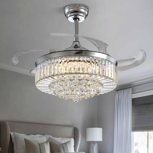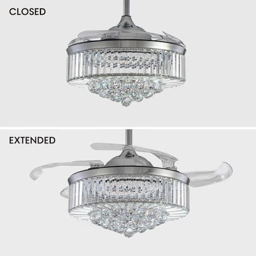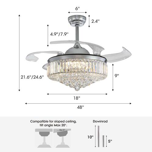 About This Product:The 48-inch Chrome Crystal Retractable Ceiling Fan combines elegance with practicality. It features dimmable LED lights and adjustable color temperatures for a customizable ambiance. The DC motor is designed for year-round comfort, adjusting easily for both summer and winter use. Control the fan with a remote or app, offering settings like 6 speed control and a timer. The blades extend to 48 inches and retract to 18 inches, making it suitable for any room, including those with sloped ceilings up to 22°. This fan is perfect for those who value both style and comfort in their living space.