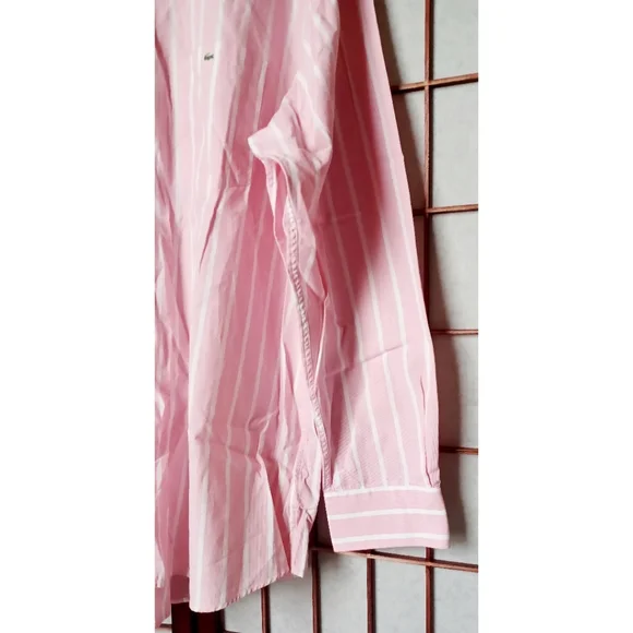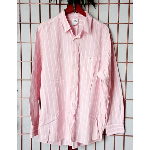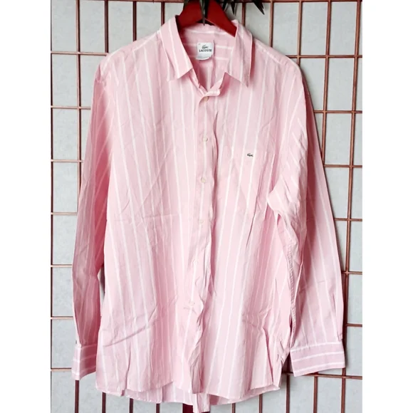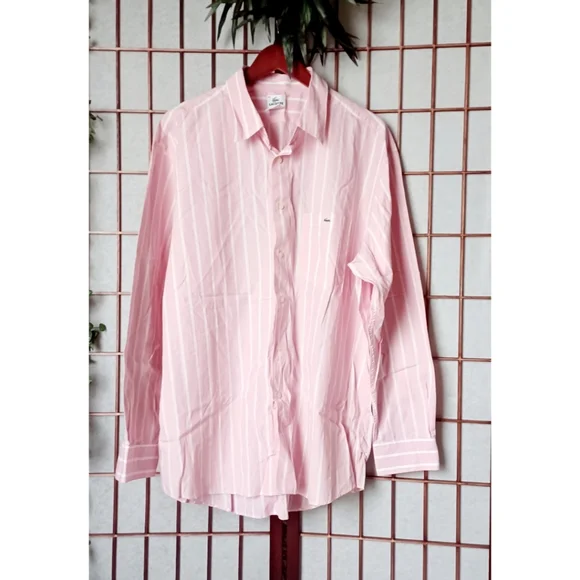 Lacoste mens pink and white striped long sleeve button-down shirt. Features:Pointed CollarLong-Sleeve with Buttoned CuffsButton-FrontStripesShirttail HemlineLeft chest pocket with embroidered logo. Fabric: 100% cotton. Designed in France, Made in Hong Kong. UEC excellent condition, men´s size 46 = U.S. size 2XL. Chest Circumference approx. 49" inches; Neck Circumference approx. 18" inches. Retail $125. Fire_Attire price $57