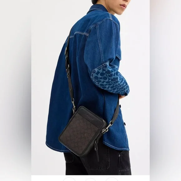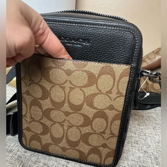 Signature coated canvas and refined pebble leather.Inside multifunction pocket. ZIP closure, fabric lining. Outside open pocket . Detachable strap with 24” drop for shoulder or crossbody wear. 6 1/4”(L)8 1/4”(H)2.0”(W)