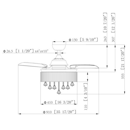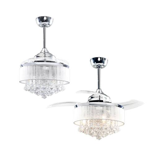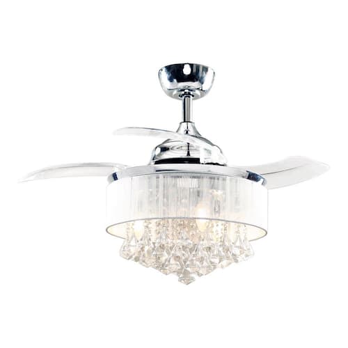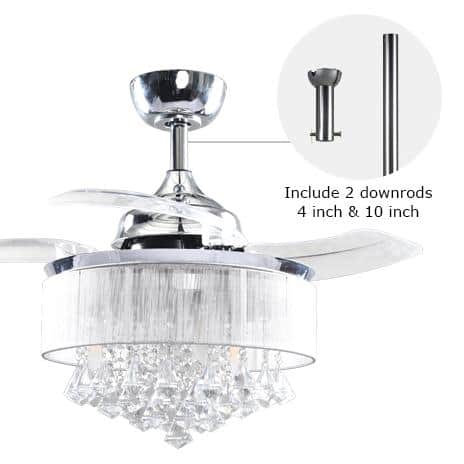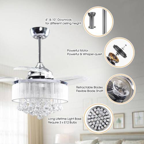 About This Product:The 36 in. Chrome Ceiling Fan Fandelier adds a touch of modern style to your living room or bedroom. It features 3-retractable ABS blades. When closed, it is a beautiful crystal chandelier to provide ample illumination. When open, it is a modern ceiling fan to provide cooling in summer. The ceiling fan comes with a light kit with crystal and drum fabric shade, you can use 3-max 40-watt (not included). Comes with a handheld remote to turn the light on/off and adjust 3 fan speeds separately. 2-down rods (4-in and 10-in) are included, raise or lower to reach your preferred height.