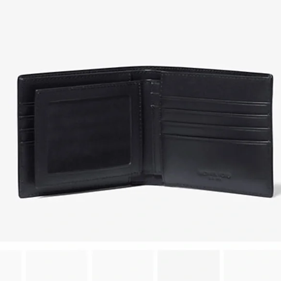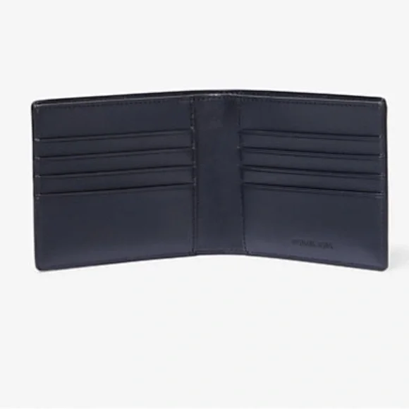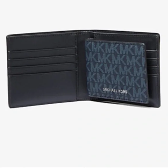 Michael Kors Cooper admrl/plblue billfold wallet with passcase NWT 8 credit card slotsRemovable passcase with 2 credit card slots and ID pocket2 billfold pocketsBlack with blue signature MK printSilver Michael Kors logo36U9LCRF6BNew with tags