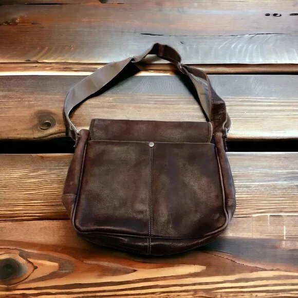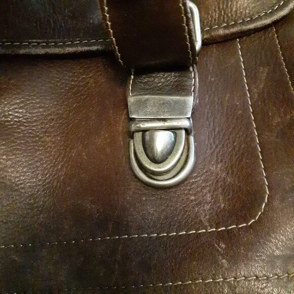Condition: The leather dye is worn and needs a new dye or conditioning.It´s extremely heavy and rugged. There are a few marks inside.See photos.The size is 17" x 13".The closure is 2 pull locks.It is very well made. There are some marks on the inside lining, but overall this is an extremely well made bag.See Photos.