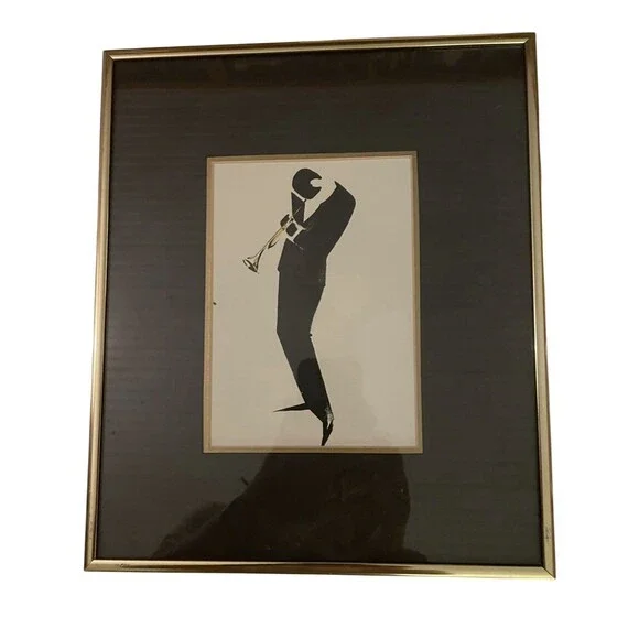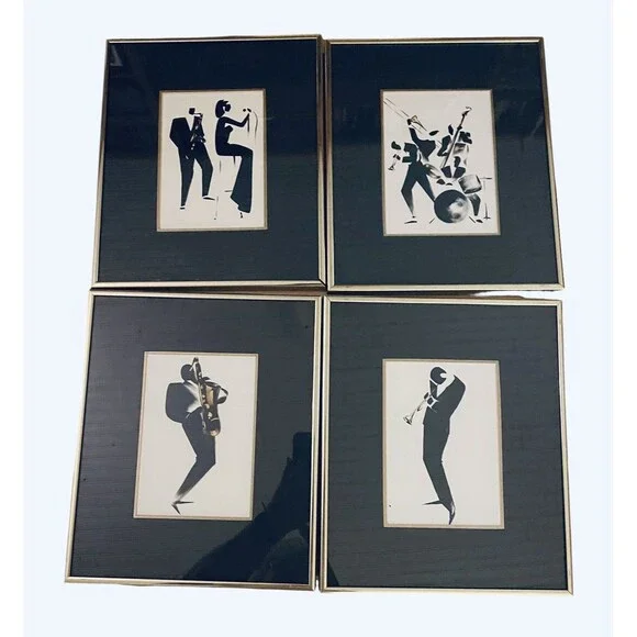Set of 4 prints featuring jazz musicians circa 1992. All are under glass, matted and framed in gold metal frames. Frames measure 12x10 each. Great condition.