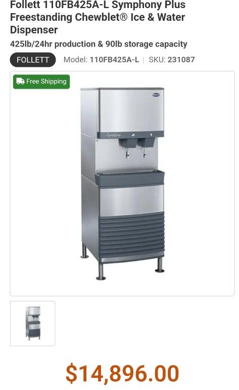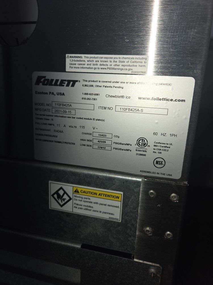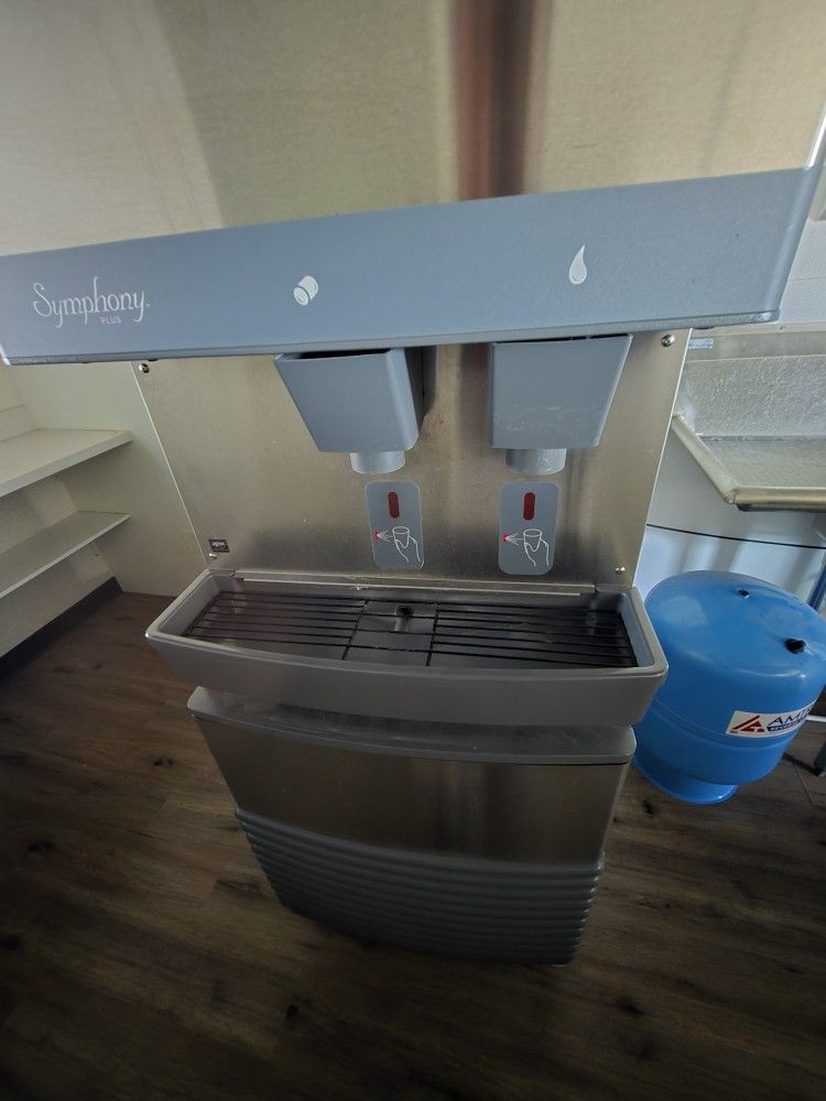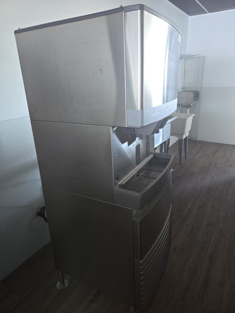 2 years old. Designed for enhanced sanitation, cleaning, and serviceability, the Symphony Plus 110 Series freestanding ice-only dispenser with lever dispense actuation features 90 lbs of ice storage capacity with up to 425 lbs daily production of Chewblet nugget ice for situations that demand lots of ice.Features:Symphony Plus™ Ice & Water DispenserFreestandingLever dispenseRemovable ice machine in baseAutomatic loadChewblet® iceAir-cooled condenserUp to 425 lb. production in 24 hours90 lb. storage capacityStainless steel cabinet with accent trimDesigned for enhanced sanitation, cleaning, and serviceabilityWater system regularly expels minerals and impurities for lower maintenance costs and better-tasting iceKey components protected with silver based antimicrobial to inhibit growth on treated surfacesQuiet Night™ Sleep mode feature reduces ice machine cycling and energy consumption during off hoursUses up to 20% less energy and up to 40% less water to produce ice than similar-sized, cube-type ice machinesSemi-automatic cleaning and sanitizing reduces service time to one hour6" adjustable legs115v/60/1-phNSFcETLusWarranty:3 Year Parts & Labor Warranty5 Year Parts-Only Compressor Warranty