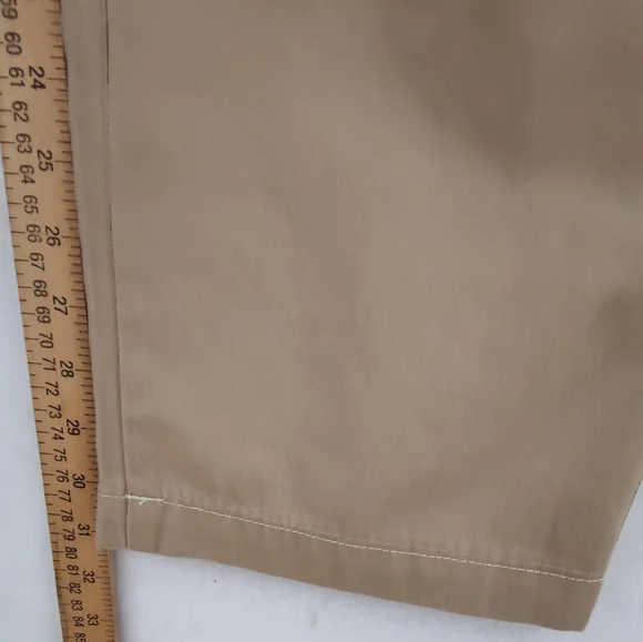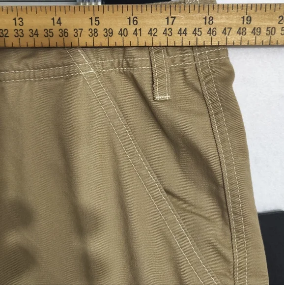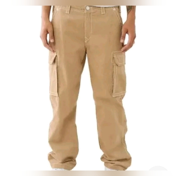 This is a pair of men´s True Religion cargo pants in a khaki color, featuring a relaxed fit and a size 33 waist. The pants have a flat front design with cargo and slash pockets, making them practical for everyday wear or travel. Made from a fabric blend of polyester and cotton, these lightweight pants are easy to care for and comfortable to wear in all seasons. They are accented with zippers and the True Religion logo, adding a touch of style to the casual cargo pant design.