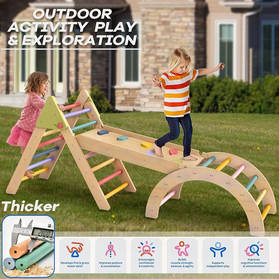 L17$85Pikler Triangle Set 3 in 1 Montessori Toddler Climbing Toys Indoor, Toddler Climbing Gym Indoor PlaygroundQuality Support: We offer full support for any parts that are not intentionally damaged. At AIWO, we are committed to crafting high-quality products and providing excellent customer serviceEnhanced Design for Toddlers 1-3: Unlike other climbing sets, our Pikler Triangle features 7 horizontal bars on each side, providing a denser, more secure climbing structure that’s perfectly suited for younger kids. This design also allows for more height adjustment options with the included slide and arch. Otherwise, the anti-slip rubber feets keep it stable on any floor surface, whether wood or tile3-in-1 Pikler Triangle Set: This Pikler Triangle climbing set includes a Triangle Ladder, Slide, and Arch Ladder, offering 7 versatile configurations for your child to explore and create endless play possibilitiesQuality and Safety First: The aiwo Montessori climbing set is crafted from trong, thick wood, ensuring a safe play experience. It meets ASTM F963-17 and CPSIA safety standards—making it the great choice for parents who prioritize safetySturdy & Easy to Assemble: Designed to withstand up to 160 lbs, this toddler jungle gym has passed rigorous drop and weight tests. Assembly is a breeze with the included step-by-step instructions, and the foldable design makes storage simple and space-efficientST-L00130
