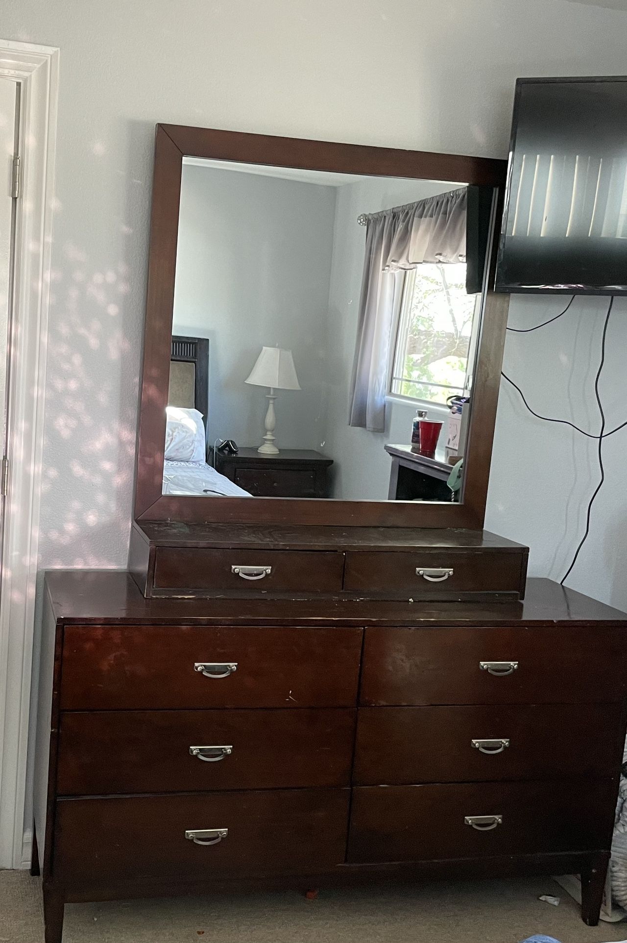 Bedroom set FULL SIZEINCLUDESDRSSER (wood)MIRROR (wood)NIGHT STAND (wood)FULL MATTRESS FULL BOXSPRINGMETAL FRAME SEE PHOTOS