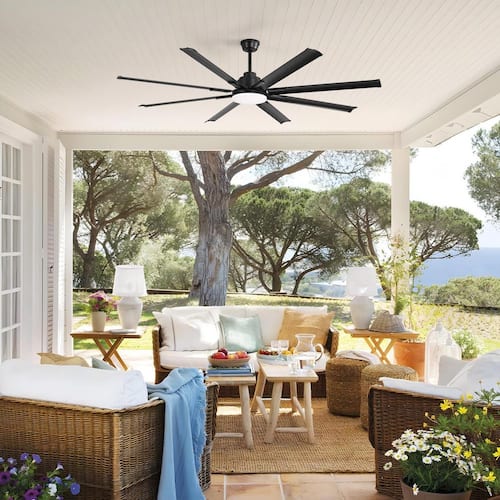 About This Product:The CACI Mall 84 in. Black Ceiling Fan has a 8 blade modern windmill design that will fit with many indoor or covered outdoor decors. You can hang it in a living area or family room to keep things cool in the Summer time and even the reverse motor to circulate indoor air and keep it warm in the Winter. This fan puts you in complete control with various options: use the included remote, the SMART LIFE App on your smart device, or simply command it with Alexa or Google Assistant for a hands-free experience. The integrated LED light kit offers versatile lighting options. Choose from 3,000K, 4,000K or 6,000K light output options. The DC motor has 6 speeds and the included remote controls the power, dimming, timing, color temperature and speed functions. DC motor fans are 70% more energy efficient than AC motor fans.