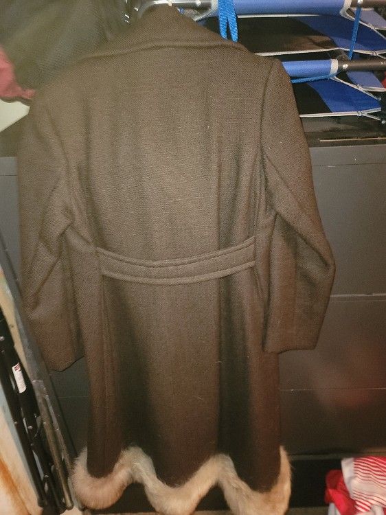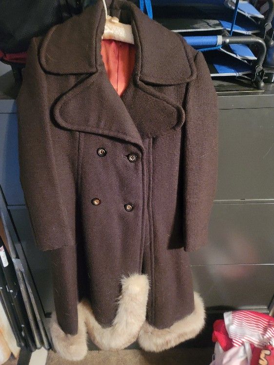 Tweed dark brown coat with fur trim. VINTAGE. With garmet bag. Cash only